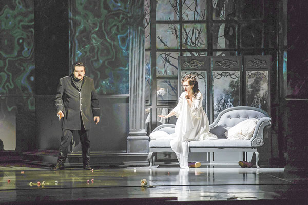 Размывая прямые петербургские архитектурные цитаты, художник Виктор Герасименко вослед концепции режиссера открывает более широкое поле для психологического триллера, замешанного на фрейдистских мотивах. Именно на этом поле действует дирижер Марко Боэми, стараясь проникать в подсознание. Тенору Николаю Ерохину удалось экспрессивно провести на крещендо линию своего героя – от зарождения безумия до его разрушительной кульминации и гибели. Лиза здесь – как тень Графини, что, прежде всего, читалось на уровне платьев тех же фасонов и цветов, доминирующим среди которых в памяти остался фиолетовый – цвет мистический.