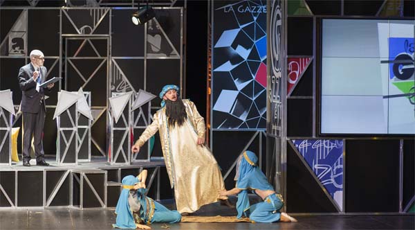 Авторы новой концепции придумали и новые говорящие фамилии героям. Так, только что назначенный директор телеканала La Gazzetta – Дон Помпонио Деньгелла, а только что уволенный несчастный – Ансельмо Пенсьоне, который в одной из мизансцен читает почти трагический монолог о том, что реальность Сети пожирает реальность жизни и лайки заменили встречи, а «селфи» – подлинные впечатления. Эффектно были прозваны и потенциальный завидный жених, который стал звездой эстрады Альберто Трендуччо, и охранник телеканала – Филиппо Недалече, и администратор телеканала – Траверсен Гадэтти. Своим острым глазом режиссер произвела и отличный кастинг, который оказался удачным и по внешним, и по внутренним, то есть вокальным, характеристикам. В партии Дона Помпонио на первом спектакле блеснул бас Александр Подмешальский, которому с этого момента можно смело присуждать статус баса-буффо. Его жесты, его плотоядно-лукавые взгляды, походка – все работало на образ ушлого директора-временщика, который не постоит за ценой, лишь бы организовать шоу поскандальнее. Роскошными формами, а также глазами и губами козыряла его секретарша – мадам Бриджит Ля Роз – Екатерина Курбанова в первый вечер. На одном из следующих спектаклей ее спела Юлия Неженцева, которую все помнят по фантастически прелестной Золушке. Юлия нашла совсем другие краски более хищной и расчетливой сотрудницы, очаровав не только своим пением, но и тембрально богатыми разговорными диалогами. Как на подбор были и дочери Деньгеллы – Лизетты: настоящими конкурентками оказались молодые сопрано Ольга Васильева и особенно Виктория Романова, о которой могут мечтать многие итальянские театры. По-россиниевски прекрасны были и дочери уволенного директора – Дораличе в исполнении меццовых колоратур Анастасии Мещановой и Дарьи Росицкой. Нашлись и два россиниевских тенора, правда, с разным вокальным запасом прочности: сияющий и брызжущий оптимизмом Антон Росицкий и более мечтательный Рорман Карпяк. На радость придирчивым критикам очень приличным, деликатным и остроумным оказался и оркестр под управлением Анатолия Рыбалко. Если в наше трагикомическое время есть силы и ум ставить Россини, значит, еще не все потеряно и есть надежда.