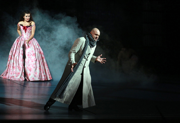 Смущало лишь имя режиссера-постановщика, ведь семь лет назад Жагарс уже воспользовался шансом «подарить» Москве постановку «Набукко» на сцене «Новой оперы» – вполне смотрибельную, но никакого отношения к опере Верди, в сущности, не имеющую. В новом «подарке», преподнесенном все той же латвийской постановочной командой, – к режиссеру присоединились сценограф Андрис Фрейбергс, художник по костюмам Кристине Пастернака и художник по свету Кевин Вин-Джонс – на первый взгляд все очень мило и даже вполне логично. Внешняя «картинка» спектакля, в принципе, неплоха: сюжетной истории она вполне толерантна. Но весь фокус заключен в том, что спектакля как такового просто нет, ибо нет концепции, которая бы эту сюжетную историю рассказывала так, что в нее можно было бы поверить, пропустить через себя и почувствовать то главное, за чем мы приходим в оперный театр, – таинство, рождаемое слиянием зрительных образов и музыки. Вместо этого нам предложили пустой холодный лоск надоевшей эстетики европейского постмодернизма и откровенную иллюстративность: музыка и режиссура в этом спектакле, построенном на традиционном наборе мизансцен, существуют сами по себе.