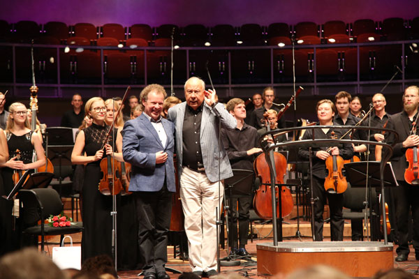 Концерт открылся последней, Одиннадцатой симфонией эстонского композитора Эдуарда Тубина. Продирижировать этим незавершенным в связи с кончиной автора опусом выпало, самому старшему и опытному участнику академии, живущему и работающему в Кёльне москвичу Александру Земцову. Играя на альте, Александр имеет серьезный опыт работы в оркестрах с выдающимися дирижерами. Несмотря на относительно небольшой хронометраж симфоническое полотно Тубина написано с серьезной основательностью, напоминая медленные части малеровских симфоний. Дирижер прекрасно справился с непростой формой, выстроив мощные громогласные тутти духовых, обозначив тяжелые степенные ходы в басу, подчеркнув диалог между вопрошающим тромбоном, и отвечающим ему хором струнных. Прозвучавший вслед за Тубиным концерт для трубы Александра Аратюняна по контрасту из сферы тягостных размышлений вывел к безоблачной радости бытия. В созданном в 1950 году сочинении можно было услышать отголоски народных танцевальных мелодий с характерными острыми синкопами и почти прокофьевскими гармониями. Приглашенный из Москвы трубач-виртуоз Владислав Лаврик легко выигрывал искрометные пассажи, а немецкий дирижер Леонард Эльшенбройх тщательно обозначал все вступления и умело выдержал темп.