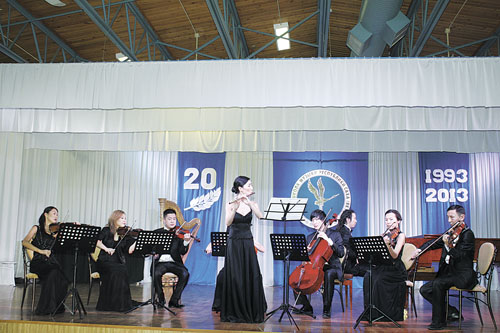Начал концерт прославленный ансамбль скрипачей «Виртуозы Якутии» – лауреат семи международных фестивалей-конкурсов. Солистами выступили лауреат международных конкурсов Александр Корякин (фортепиано), дипломант всероссийского и лауреат международного конкурсов Александр Ушницкий (вокал), лауреаты международных конкурсов Ефросинья Ефимова и Екатерина Скурту (скрипка), лауреаты всероссийского конкурса Мария Дедюкина и Алина Леонтьева (арфа), дипломант международного конкурса Светлана Сивцева (саксофон), лауреат международного конкурса Вячеслав Захаров (виолончель). В концерте достойно выступили лауреат всероссийского и регионального конкурсов ансамбль флейтистов (рук. Л. Дедюкина), лауреат международного конкурса камерное трио класса доцента Л. Спиридоновой, лауреат регионального конкурса ансамбль виолончелистов класса профессора О. Кошелевой, фортепианное трио класса старшего преподавателя Л. Уразбахтиной. Блистательно завершил первое отделение струнный ансамбль «ArcoArtico» – лауреат международного музыкального конкурса (руководитель А. Дедюкин). Второе отделение, прозвучавшее на одном дыхании, было полностью отдано Камерному оркестру Высшей школы музыки (дирижер С. Афанасенко).
