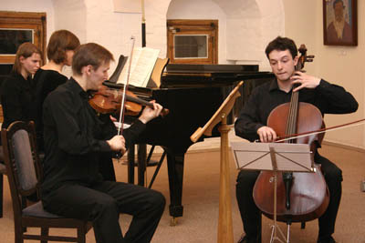 В небольшом уютном зале, в интерьере картин Святослава Рериха, от которых идут удивительные «энергетические излучения», звучала классическая и современная музыка. Участники вечера достойны особого внимания. Это, прежде всего, выступившее в первом отделении фортепианное трио в составе победителей международных конкурсов, стипендиатов фонда «Новые имена»: скрипач, аспирант Московской консерватории по классу профессора Э.Д.Грача Никита Борисоглебский (лауреат Первого всероссийского открытого конкурса юных музыкантов «Новые имена», Москва, 2000 г.); виолончелист, аспирант Высшей школы музыки Ганса Эйслера в Берлине по классу профессора Д.Г.Герингаса Евгений Тонха (лауреат фонда «Новые имена» с раннего детства, многократный участник Суздальской летней творческой школы); пианистка, студентка IV курса РАМ им. Гнесиных по классу Е.В.Державиной Надежда Саминская. Во втором отделении вечера на сцене царили два Евгения: пианист, студент I курса Московской консерватории по классу народного артиста В.К.Мержанова, эмоционально-взрывной Евгений Андреев и – настоящее открытие концерта – певец, студент IV курса Московской консерватории по классу народного артиста России Б.Н.Кудрявцева Евгений Кунгуров, одаренный баритоном редкой красоты и большим артистизмом. С 2005 года Евгений Кунгуров - стипендиат фонда «Новые имена», участник многих концертов «новоименцев». Хочется верить, что в ближайшем будущем его голос станет украшением лучших оперных сцен. Нам захотелось поближе познакомиться с Евгением: он оказался интересным собеседником, произвел впечатление человека широких интересов, целеустремленной и цельной личности, живущей в согласии с миром природы.