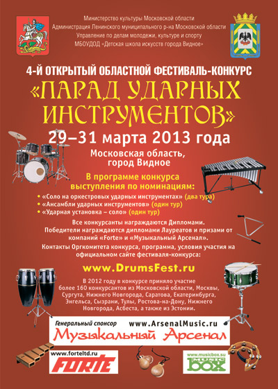 29-31 марта 2013 года в г. Видное Московской области состоится фестиваль-конкурс «Парад ударных инструментов», в котором будут состязаться исполнители, в том числе из дальнего зарубежья, на традиционных ударных инструментах и на ударной установке в различных стилях современной музыки.