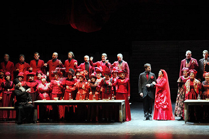 Режиссер самарского спектакля Георгий Исаакян к «Леди Макбет…» обратился впервые. Возможно, поэтому он выбрал сугубо неавторскую, традиционную интерпретацию – новации незначительны, и в общем опера предстает практически в аутентичном виде. Характеры раскрыты с максимальным уважением к автору партитуры, режиссура музыкальна, чутко откликается на логику оперной драматургии. Эротические моменты (когда-то – роковые в судьбе оперы) решены деликатно: хотя Сергей и обнажается по пояс, овладевая Катериной, визуально доминирующее на сцене любовное ложе прикрывает шеренга оркестрантов-духовиков, выходящих на авансцену и почти сметающих экспрессией звукового напора зрителей первых рядов партера. Наиболее необычными решениями смотрятся два: молчаливое присутствие преступной пары в сцене обнаружения Задрипанным мужичонкой трупа Зиновия Борисовича и багровые тона на свадьбе – в кровавый подвенечный наряд одеты и преступница Катерина, и все гости. Последнее, возможно, месседж о виновности не только главной героини – весь убогий провинциальный мирок запачкан кровью, это его уклад довел купчиху до злых дел. Безусловно, идея абсолютно созвучная Шостаковичу, его (в отличие от лесковской) трактовки судьбы, характера и мотивов Катерины.