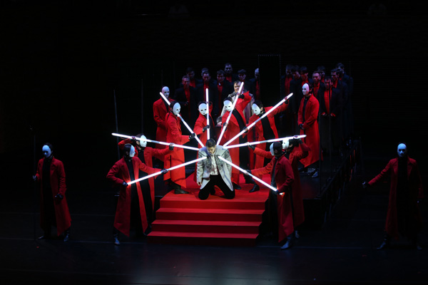 Семистейджевская условность, допустимая на открытых площадках, весьма странно смотрелась в пространстве концертного зала. Мрачная черно-багровая цветовая гамма (художник-постановщик Юлия Гольцова) никак не сочеталась с пышным многоцветьем партитуры, а направленный в зал красный прожектор (художник по свету Михаил Голубков) вызывал ассоциации с дешевыми фокусами. Банальными решениями стали бросаемые в сцене свадьбы Андрея и Натальи розовые лепестки и расстилаемые перед молодоженами простыни. А поставленные Константином Чувашевым танцы опричников больше напоминали массовую физкультурную зарядку. Длинные (в пол) красные камзолы опричников в сочетании с надетыми белыми масками вызывали сначала восточные ассоциации, но затем доставаемые «световые мечи» увели сознание в сторону фантастики «Звездных войн». Так ребенок, насмотревшись современных фильмов и мультфильмов в стиле аниме, пытается представить себе прошлое через призму героев комиксов. Но, может быть, в этом и был пафос спектакля?..