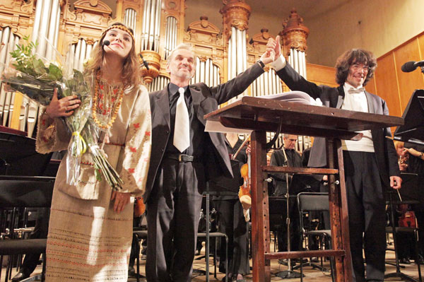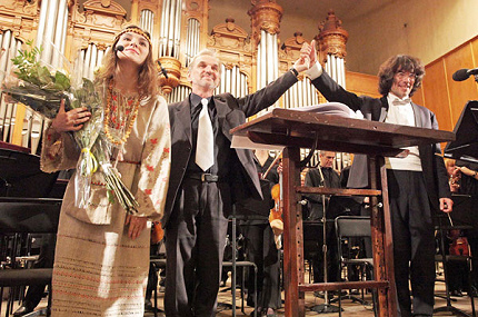 На фото: после исполнения «Навны»: О. Лесничая, С. Жуков, дирижер Е. Бушков