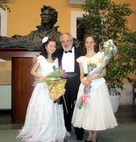 В первом отделении, однако, прозвучало далеко не шуточное произведение – Концерт для скрипки и фортепиано с оркестром ре минор Мендельсона. В качестве солисток выступили друзья оркестра «Kremlin» - молодые музыканты Анна Савкина (та самая скрипачка из Иркутской области, ученица МССМШ им. Гнесиных) и пианистка Анна Денисова (ученица ЦМШ при Московской консерватории). Обе девушки – победительницы нескольких всероссийских и международных конкурсов, многократно выступали с ведущими коллективами и такими дирижерами, как Ю.Башмет, В.Спиваков и А.Рудин. Их блестящая игра - их виртуозность и музыкальность на первых же минутах вызвали удивление и восторг публики, порывавшейся начинать овации между частями произведения и строго сдерживаемой дирижером. Зато в конце были такие аплодисменты, о которых говорят: «шквал».