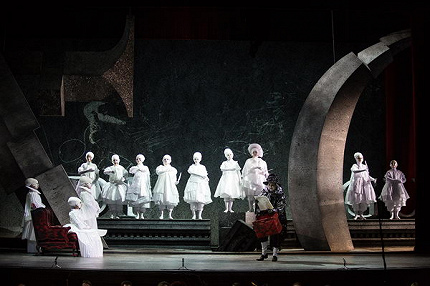 В сочетании с мизансценами Н. Анастасьевой-Лайнер, светом Сергея Скорнецкого и видеоанимацией Аси Мухиной, сценография и костюмы Юрия Харикова, обращенные и к театру актеров, и к театру масок, графически завораживающе преломляются в эстетике «визуального экспрессионизма». В философски самодостаточной геометрии форм, объемов и фрагментов гигантских латинских букв, присутствующих в названии опуса, царят черный, белый и красный цвета (плюс разные оттенки серого). В костюмах и реквизите – дозированная эклектика: древнегреческая атрибутика, приметы английского уклада жизни и пародия-гротеск на кажущуюся сегодня наивной драматургию трагического шедевра Пёрселла. И если и та, и другая музыка берет в плен сразу, но по-разному, то увлекательный постановочный пазл уверенно складывается лишь к финалу проекта.