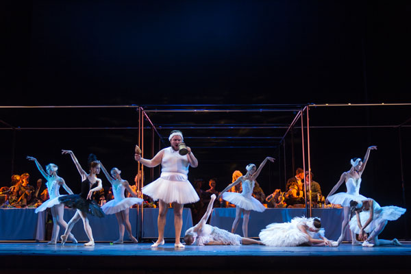 Спектакль проводит нас по всем кругам человеческой жизни, где любят, радуются жизни, страдают, празднуют, создают семьи, занимаются политикой, рождаются и умирают. Все или почти все персонажи одеты в современные одежды, и тем больший эффект производит появление в финале первого акта, в сцене в таверне, фигур в барочных костюмах. Блистательно придуман и разработан режиссером вместе с хореографом Кириллом Симоновым «лебединый эпизод» – гротескный парафраз в миниатюре самого знаменитого балета всех времен и народов.