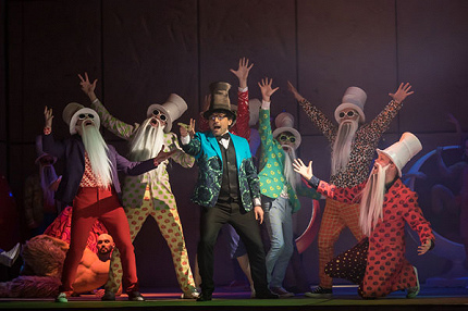 На сей раз лаконичная универсальность геометрических символов – буквально кругов и колец, цилиндров и конусов, квадратов и линий в чистом виде – сюжетную конкретику визуального каркаса сценографии (при всей его графически четкой прорисовке) намеренно уводит во вневременное, метафизическое измерение. При этом безошибочное ощущение именно нашего времени достигается в силу карнавальной эклектики костюмов, в которые на тематических вечеринках облачаются сегодняшние хипстеры.