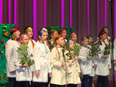 Основу этого музыкально-драматического действа составил фрагмент из Пролога к опере Н.А. Римского-Корсакова «Снегурочка» – он был поставлен практически целиком, включая обряд проводов Масленицы. Народные сцены из жизни берендеев удивительно органично соединились с театрализованной интерпретацией хоровой музыки Г. Свиридова: прозвучали «Ты воспой, воспой, жавороночек» из «Курских песен» и «Запевка» на стихи И. Северянина («О России петь…»). Постановку украсили лаконичные декорации – панно, поначалу изображающие ледяные горы, а затем зеленый лес, а также яркие костюмы главных героев оперного Пролога и народные у «берендеев», выполненные в обобщенном русском стиле.