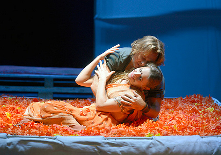 Ориентальная атмосфера Индии ощущается весьма сильно: ее яркое пятно-символ – оранжево-красная палитра костюмов и огромного цветочного ложа (артефакта безграничной любви Селики к Васко). В своем финальном монологе королева Селика под действием ядовитых паров манцинеллы погружена в смертельный транс, а опустевшее ложе поднимается почти вертикально. С него, словно осколки жизни, осыпаются отдельные цветы-лепестки, а само оно становится экраном призрачных любовных галлюцинаций главной героини. Под финальные аккорды хоров людей и духов последний приют находят здесь Селика и Нелюско, разделивший участь своей любимой и в смерти.
