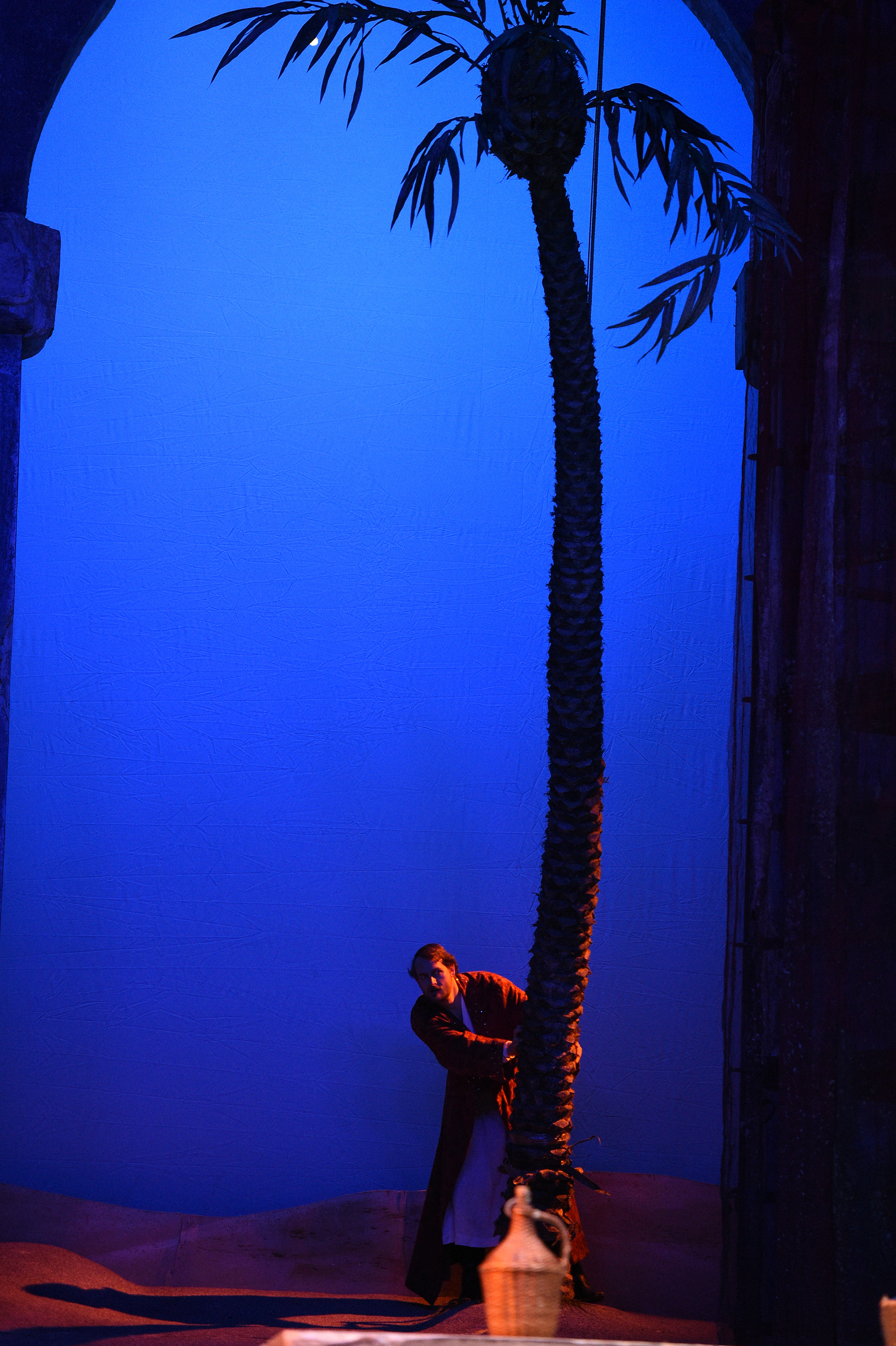 Три акта дюссельдорфского «Сераля» разворачиваются в одном пространстве (либретто Готлиба Стефани это вполне допускает): огромная византийская церковь, когда-то заброшенная и теперь находящаяся на стадии не то реставрации, не то капитального ремонта (если не переделки из культового сооружения во что-то более утилитарное). Как известно, останки погибшей византийской цивилизации щедро разбросаны по турецкой Анатолии, поэтому такое решение смотрится вполне естественно. Монохромность синих сводов храма прерывается то там, то тут проступающими православными фресками и мозаиками, в проемы окон и порталов видны качающиеся пальмы, в правой части церкви стоят во всю стену леса реставраторов.