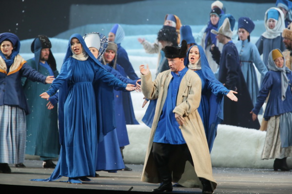 Постановка Алексея Степанюка, работавшего в команде с художником Александром Орловым и художницей по костюмам Ириной Чередниковой, очень многое усреднила, сплющила, свела до анекдота, сделав иллюстрацией к школьной программе по литературе, вплоть до картинной фигурки царей – Николая I и Александра I. Но кое-что все же сумела явить емкой, многомерной метафорой. Прежде всего, сугробный амфитеатр во всю сцену, ставший символом застылого уклада русской жизни, застывшей стихии. Эти сугробы в одной из сцен морского путешествия из Лондона в Петербург, ближе к финалу, обернутся волнами страшной бури. Шторм задает апокалиптические настроения, которые прежде едва ли можно было услышать в музыке Щедрина. А тут во всю мощь прозвучали даже не намеком слова о том, что «быть беде». Если уж столь мирный композитор, как Родион Щедрин, чувствует такое, надо и в самом деле удесятерить бдительность, чтобы беды избежать. Да только кто ж его послушает
