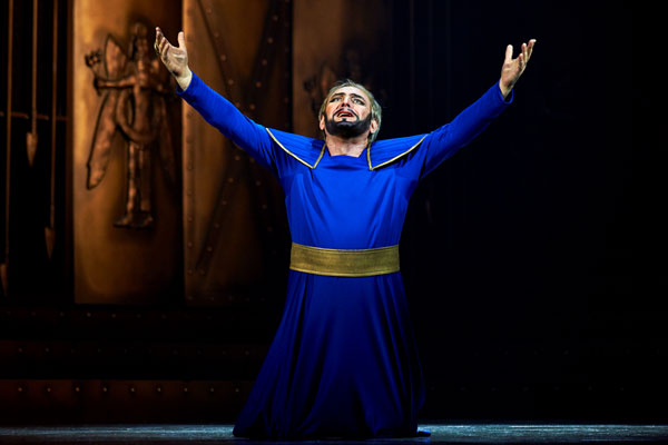 Лишь I акт происходит в Иерусалиме, в храме Соломона, где иудеи укрываются от нашествия грозного Набукко. Храм символизирован кубом с шестиконечными звездами-прорезями. Три завершающих акта – Вавилон, куда депортированы покоренные иудеи: это и царские покои, и темница, и место потенциальной казни у подножия идола Ваала. Сценографическая идея гениально проста: конструкции со скользящими перегородками-ширмами – одни и те же на все акты. Их перекрестие в центре и есть куб храма, а боковые панели стилизованы вавилонскими барельефами, которые в I акте за счет манипуляций со светом поначалу приглушены, и в финале акта храм с помощью видеографики эффектно «занимается пламенем». В трех других актах на месте храма – тронный зал на фоне идола Ваала. В финале оперы раскаявшийся Набукко, к которому после молитвы иудеев возвращается разум, весьма реалистично повергает идола в прах, но и это – видеографика. В драмах Верди счастливый финал – редкость, но финал, дарующий свободу, можно считать оптимистичным. И все же одна потеря в личном составе героев есть. Это суицид Абигайль, внебрачной дочери Набукко, раскаявшейся вслед за ним в своих злодеяниях и посягательстве на власть. Однако сюжетный проигрыш главной, но отрицательной героини, хотя и вызывает сочувствие, вряд ли сильно печалит, притом что наряду с Захарией и Набукко партия Абигайль – одна из величайших вершин мировой оперы. Несомненный интерес вызывают оба состава певцов, и если бы между басами Андреем Валентием и Сергеем Ковниром (Захариями в первом и втором составах) была возможна рокировка, то лишь тогда можно было бы четко сказать, что первый состав – сугубо драматический, а второй – в большей степени лирический.