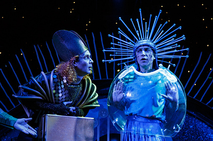 Очень важно, что для Камерного музыкального театра заветы его основателя – вовсе не догма. Опираясь на этот базис, театр смело идет дальше по пути «режиссуры здравого смысла». Именно поэтому здесь и смог родиться такой сценографически необычный спектакль. Он поставлен в эстетике лазерного шоу, однако постановщики ни на миг не забывают, что вся нелепица сюжета в жанре «научной фантастики XVIII века» должна воплощаться, прежде всего, средствами старого и доброго оперного жанра. Новаторский позитив постановки устремлен в будущее, ибо спектакль одинаково близок как среднестатистическому зрителю, так и театралу-меломану. В нем органично сочетаются венецианский карнавал, комедия dell’arte, философские символы вечной красоты и захватывающая воображение светотехническая феерия.