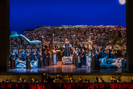 На сцене вместительного театра «Аврора» режиссер Энрико Кастильоне представил абсолютно традиционный спектакль: в нем нет совсем ничего от современных потуг радикальной оперной режиссуры. От кулисы к кулисе тянется мощная камерная кладка – это и крепостная стена галлов, и внутренний двор сакрального места друидов Ирминсула. Костюмы героев соответствуют нашим представлениям о временах противостояния римлян и галлов. Никто точно не знает, как облачались друиды, но о римлянах мы имеем вполне сформировавшееся представление, и румынский тенор Стефан Поп, исполнявший партию римского военачальника Поллиона, был экипирован в точности, как императорские статуи в Пушкинском музее или фигуры барельефов с колонны Траяна в Риме. Столь настойчивое следование историческим реалиям, видимо, соответствует вкусам местной публики, которая встречала сценографию спектакля бурными овациями. Справедливости ради надо сказать, что реалистическая картинка действительно производит сильное впечатление, особенно поначалу: яркое голубое небо над Ирминсулом, величественные жрецы-друиды, профетическая и немного безумная жрица Норма с огненно-рыжими волосами – все погружало в атмосферу старой доброй итальянской оперы.