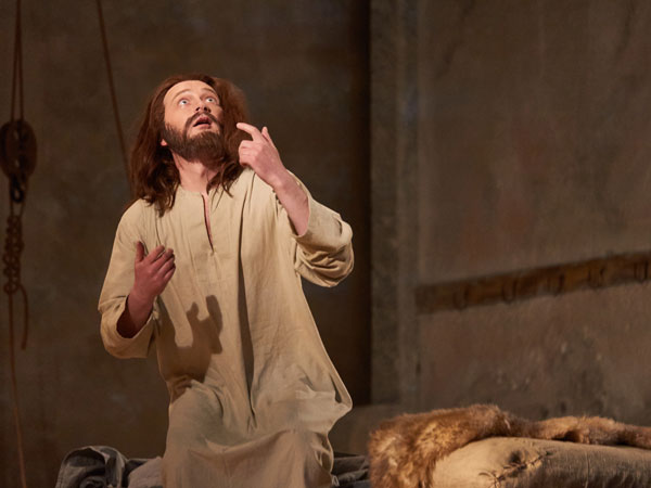 Штрассбергера волновали не антиклерикальные или социальные мотивы и не человеческие драмы, но почти исключительно мистериальная, или, если угодно, «пассионарная» линия. И здесь ему многое удалось. Режиссер старательно акцентирует все параллели с евангельскими событиями и персонажами и даже мизансцены подчас выстраивает таким образом, чтобы возникали аллюзии на известные картины (приход Манольоса к Катерине явственно ассоциируется с «Явлением Христа Марии Магдалине» А. Иванова). В этом плане режиссерская работа выглядит вполне цельной. Вот только многие режиссерские построения смотрятся чересчур статично – как внешне, так и внутренне, – что идет вразрез с эмоциональным тонусом самой музыки. И слишком уж буквально трактуется им «преображение» Манольоса в Христа – иногда почти на грани пародии: задолго до представления мистерии (так в итоге и не состоявшегося) Манольос расхаживает по сцене с большим деревянным крестом на плечах, да еще и самобичеванием занимается. Сознательно ли добивался режиссер пародийного оттенка? Не уверен. Хотя иные из сопутствующих аспектов такого «преображения» – например, добровольное «монашество» Манольоса, заставляющее бежать сначала от одной, а затем и другой любящей его женщины, – определенно не помешало бы немножко приправить иронией.