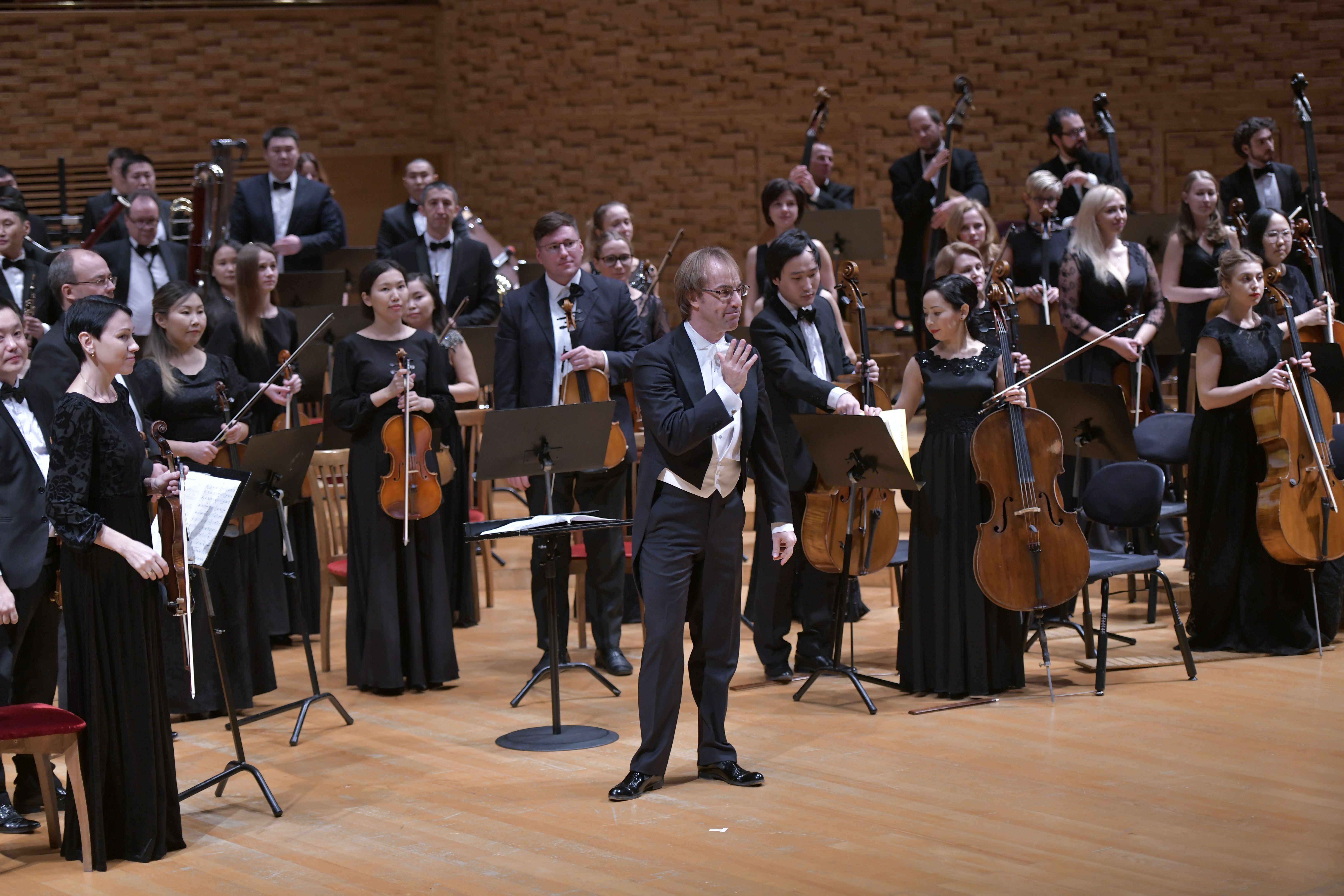 Концерт открылся хореографической поэмой «Ойуун» («Шаман») якутского композитора Кирилла Герасимова. Эта эффектная оркестровая пьеса, изображающая ритуал шаманского камлания, даже без визуального ряда впечатлила своим размахом и стихийной мощью, отсылающей к «Ночи на Лысой горе» Мусоргского и «Весне священной» Стравинского. Угловатые тритоновые ходы, попевки-заклинания были облечены в жесткий ритм постоянно нарастающего в своей силе пляса-действа, закончившегося жутковатым хроматическим сползанием у всего оркестра. Яркие тембровые находки автора (например, утробное соло контрафагота, которому отвечал хор струнных) прекрасно попадали в национальный колорит, выраженный не столько через фольклор, сколько через опять же оркестровые краски, рисующие бескрайнее холодное пространство и затерянного на этих просторах человека.