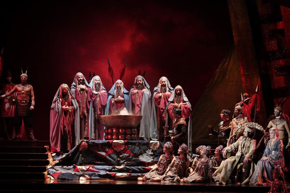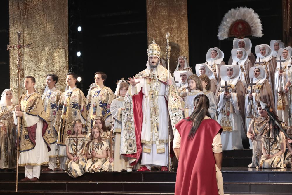 Премьерные представления «Аттилы» прошли двойными блоками в конце апреля и в начале мая (на последнем и довелось присутствовать). В мае приглашенные звезды выступали во второй вечер, тогда как первый был полностью укомплектован собственными силами. И в этом местном составе в первую очередь надо говорить, конечно, об исполнителе заглавной партии Артуре Каипкулове. Его роскошный бас прекрасно подходит для Верди, лаская слух уже самим звучанием. Ему бы еще больше вокальной культуры – и серьезная мировая карьера обеспечена. Неплохо в целом справились со своими партиями Олеся Мезенцева (Одабелла), Ян Лейше (Эцио) и, с некоторыми оговорками, Владимир Орфеев (Форесто).