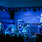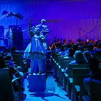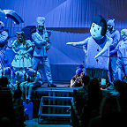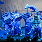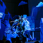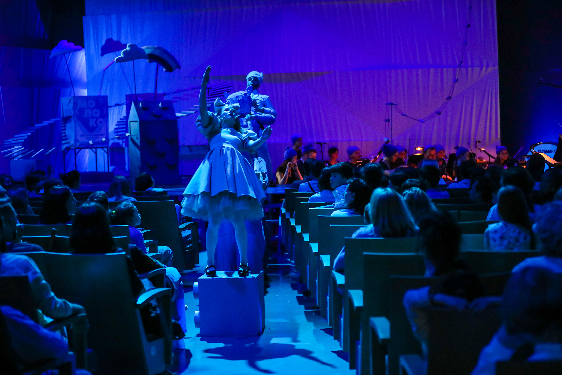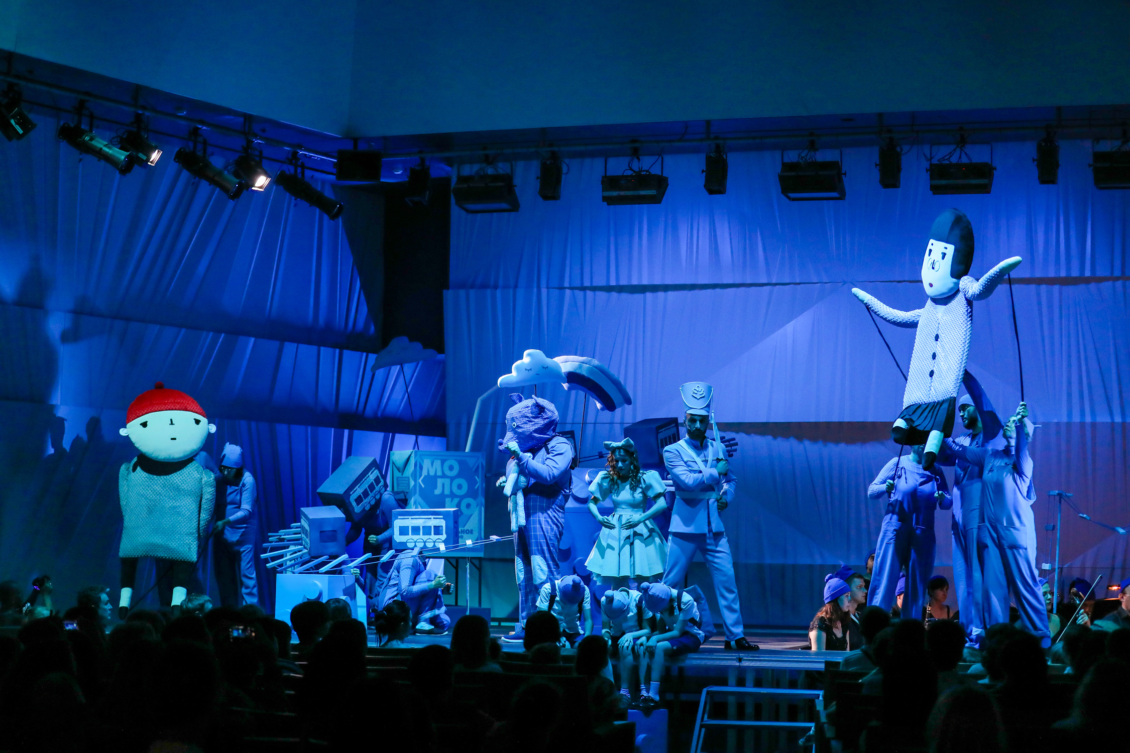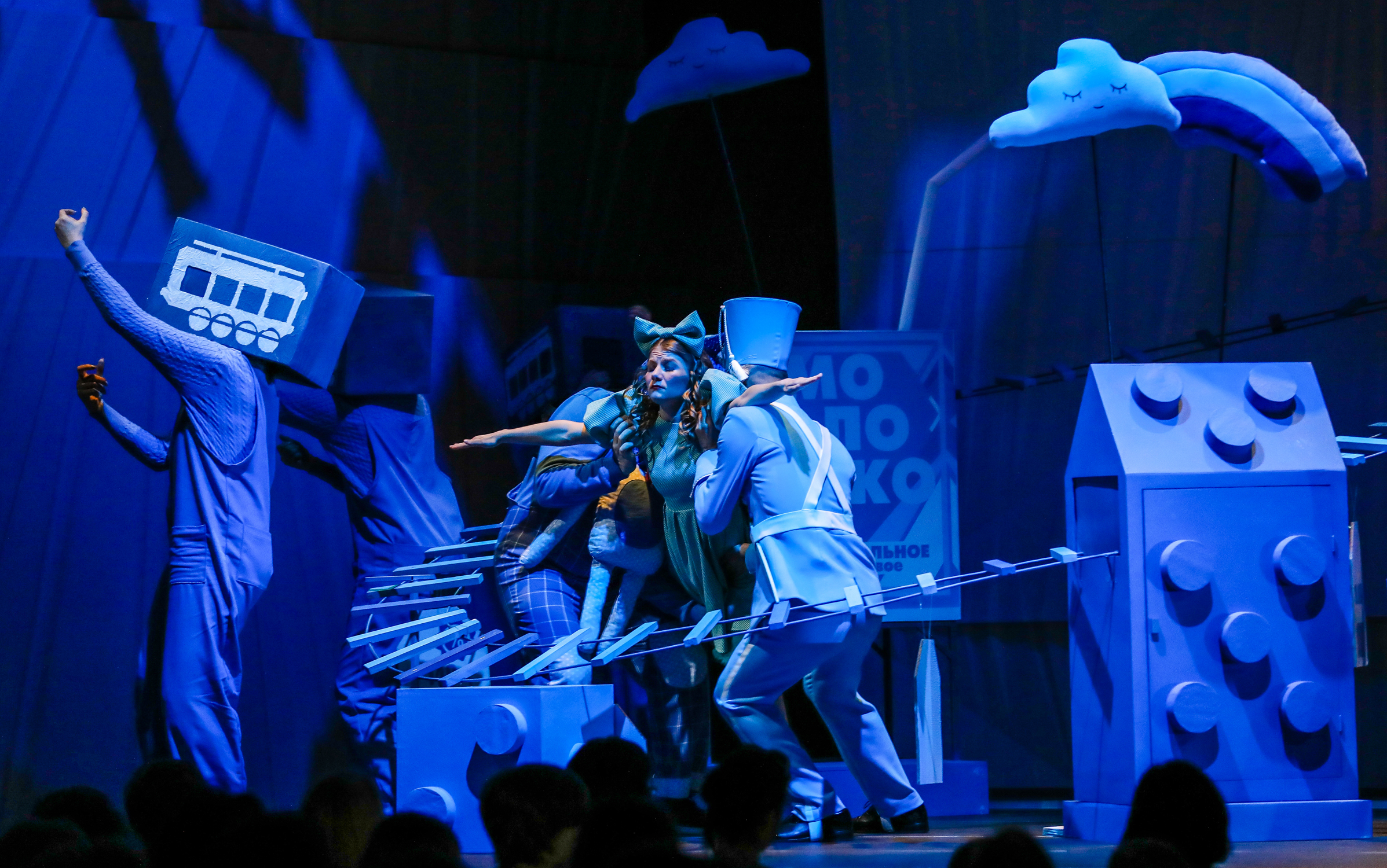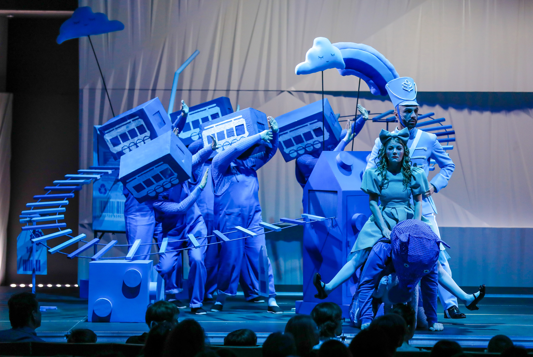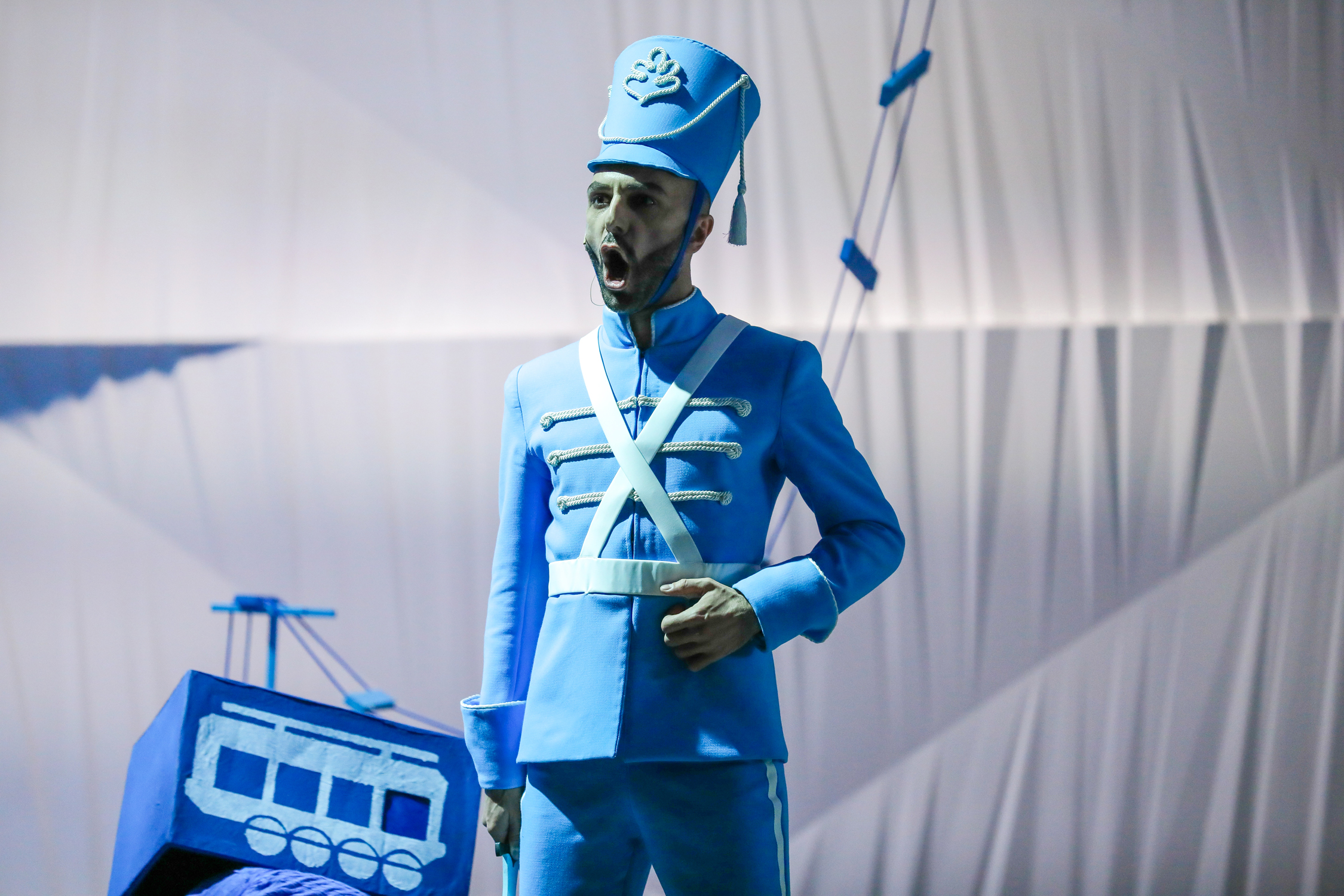 Малый зал «Зарядья» – не самое подходящее место для полноценной оперной постановки. Тем ценнее то, как талантливо справилась с постановочной задачей режиссер Василёва. Она задействовала все пространство – по проходам, мимо зрительских кресел путешествует состав из голубых вагончиков, на которых добрые игрушечные существа едут осчастливливать детвору. Огромные ростовые куклы – это Фея, она же сначала не очень добрая, а потом одумавшаяся хозяйка игрушечного магазина, и сам Мальчик: дети на них реагируют более живо, чем на артистов-людей. Весь спектакль одет в нежно-голубое (сценограф Софья Кобозева), изяществом отличаются костюмы, особенно у подтянутого, молодцеватого Генерала и «воздушной» Куклы, чей образ напоминает Мальвину из другой сказки про Италию. Спектакль получился невероятно живым и увлекательным, а зрители – что маленькие, что взрослые, только и крутят головой на 360 градусов, пытаясь успеть зафиксировать все, что происходит одновременно в разных уголках зала. Скучать совершенно некогда, поскольку у постановочной команды получилось настоящее шоу в хорошем смысле слова.