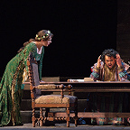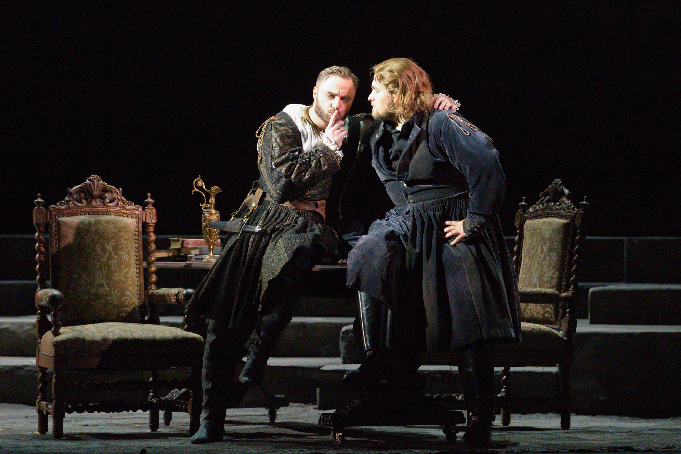 Сложнее обстояло дело с Яго. Если в прошлом году я удивлялся, почему в «Макбете» Антона Зараева поставили во второй состав, а Алексея Шишляева в первый, то теперь все было наоборот, но вокальное качество оказалось выше у Шишляева. В отличие от Макбета, чья партия во многом зиждется на кантилене, для Яго требуются, с одной стороны, резкие и жесткие краски, с другой – тончайшая нюансировка, предельная интонационная гибкость, и этих качеств Зараеву и не хватило. Он был интереснее как актер, но голос звучал напряженно, форсированно, даже хрипло, а на прописанные у Верди несколько piano в знаменитом «Сне» не было и намека. У Шишляева тоже не все сразу получилось (в первой картине он невнятно бормотал речитативы, словно бы не вполне понимая смысл итальянского текста), но уже во второй картине придраться было решительно не к чему.