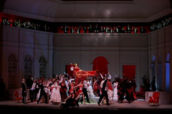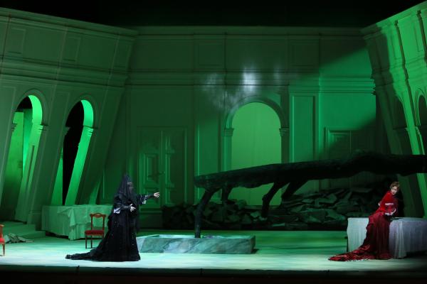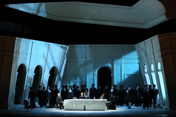 Работа Дэвида Паунтни является копродукцией с лиссабонским театром «Сан-Карлуш»: в 2003-м премьера прошла именно там и лишь потом на Мариинской сцене. За прошедшие годы постановка возобновлялась в Неаполе, а в Петербург вернулась уже на сцену Мариинки-2. Спектакль, как водится у британского мэтра, радикально режиссерский, но гармоничный и интересный, играющий новыми смыслами и, безусловно, режиссерски сделанный: детали пригнаны друг к другу, как в цейсовском часовом механизме. Его эстетика может не нравиться и даже возмущать, но высокий уровень профессионализма отрицать просто бессмысленно.