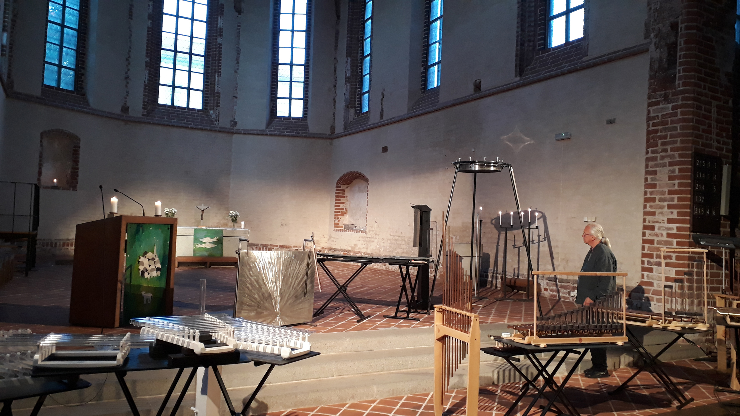 Кульминацией фестиваля я бы назвала импровизационный проект Knock on the sky and listen to the sound Йохена Фассбендера – немецкого изобретателя, как сейчас модно говорить, «звуковых объектов» из металла, камня и стекла. Трубы и трубочки всевозможных диаметров и размеров, длиннющий полукруглый рог, самодельная флейта, на которой Йохен исполняет восточную мелодию, тонущую в тишине… Разнонастроенные каменные пластины, как бы ритуальные металлические треугольники, размывающие высотность звука стеклянные трубки-резонаторы, обертоновые природные шкалы – все это отсылало воображение к доисторическим временам и воссоздавало некий прамузыкальный образ. Йохен устроил в Jaani kirik углубленную медитацию-перформанс, которая началась с его появления из зрительного зала с «архаическим» металлическим рогом. Звучание рога, перенасыщенное шумами и обертонами, подобно камертону сразу настроило аудиторию в нужном ключе. А под конец некоторые слушатели были приглашены на сцену и сами стали непосредственными участниками сакрального действа. Никакой подготовки не требовалось: обертоновые звукоряды по определению не могут звучать плохо.