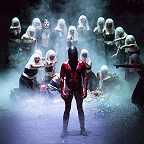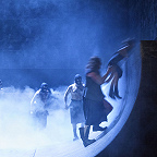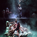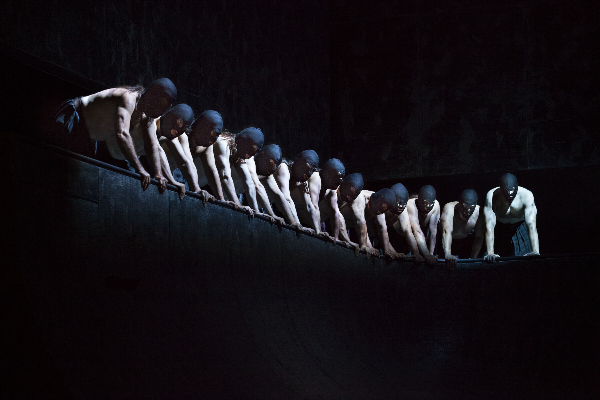 Главная сценографическая идея (художник Хенрик Ар) – мрак. Темнота господствует тотально (художник по свету Стефан Боллигер). Даже из первых рядов партера приходится пристально вглядываться в происходящее – уже на авансцене фигуры различаются с трудом, не говоря о том, чтобы всегда четко понимать, что делается у задника. Эта «темень темная, непроглядная» выполняет сразу две функции. Первую – невольно (не думаю, что постановщики добивались именно этого): она несколько смягчает триллер-подробности постановки, и некоторые слишком откровенные моменты (например, расчленение и поедание ведьмами трупа Банко) не смотрятся столь уж омерзительно. Вторую – вполне сознательно: подчеркивает брутальность и практически античную запрограммированность сюжета на предопределенность и беспросветность.