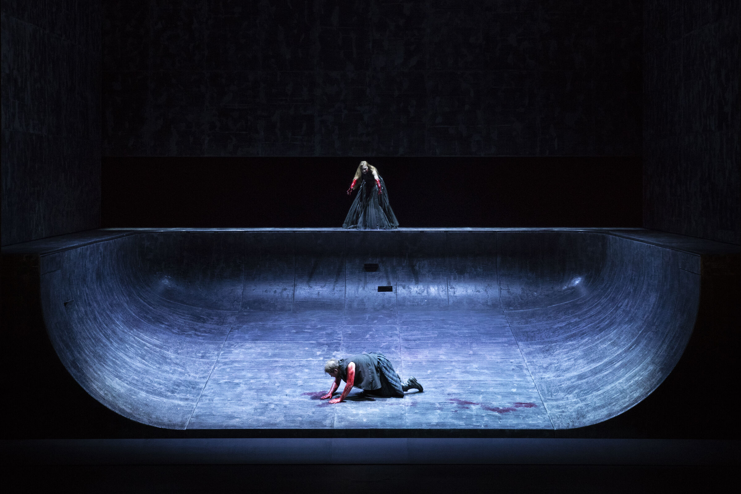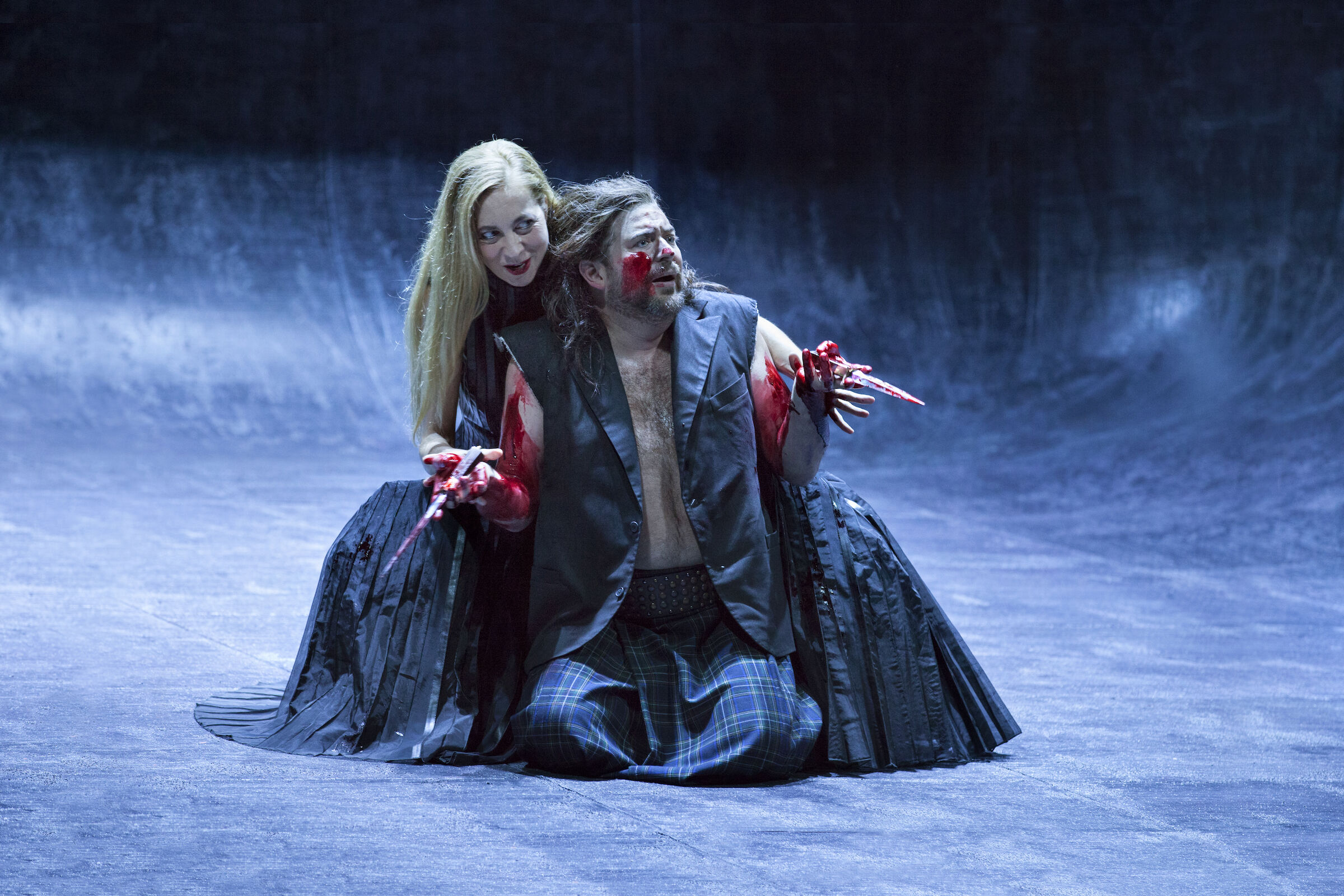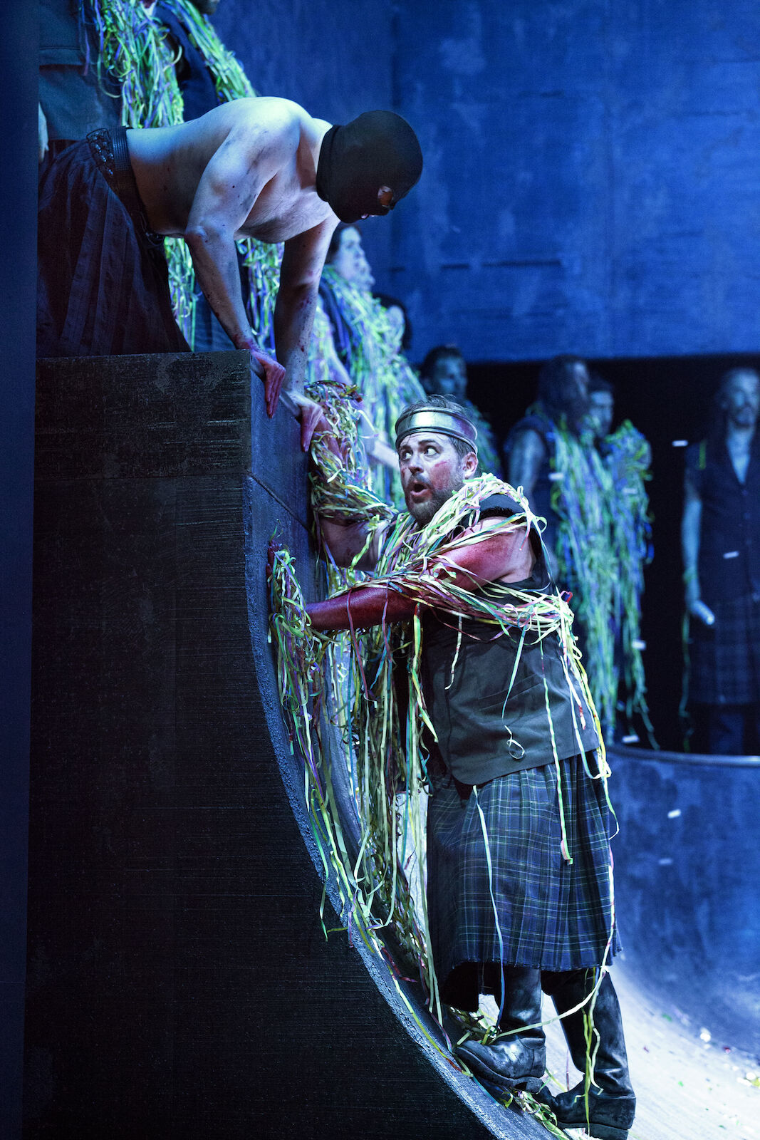 Режиссер Михаэль Тальхаймер вечную историю о борьбе за власть оставляет в мрачном шотландском Средневековье (о чем свидетельствуют грубые костюмы Микаэлы Барт, особенно традиционные килты и жилетки - безрукавки на голом теле у мужчин), не прибегая к переносам, ставшим сегодня общим местом режиссерской оперы. Сцена представляет собой огромную черную лохань, отвесные скользкие стены которой не дают возможности героям, раз скатившимся на дно, выбраться оттуда. Это своего рода метафора – преступления, совершаемые четой Макбетов, крепко приковывают к дну титульных персонажей. Нетрудно спрогнозировать: продолжившие кровавую борьбу за власть Малькольм и Макдуф в финале оперы оказываются на том же самом безнадежном дне, как и их предшественники. Идея о том, что в Шотландском королевстве не все в порядке на системном уровне, совсем не нова, ее часто используют для усиления трагического эффекта в «Макбете» (что на драматической сцене, что в опере), по сути она очень верна и хорошо работает: в этом котле бесконечных преступлений, подлости, борьбы за свое место под туманным, если не ночным шотландским солнцем, варятся все персонажи, и правых нет — одни виноватые.