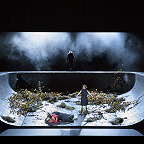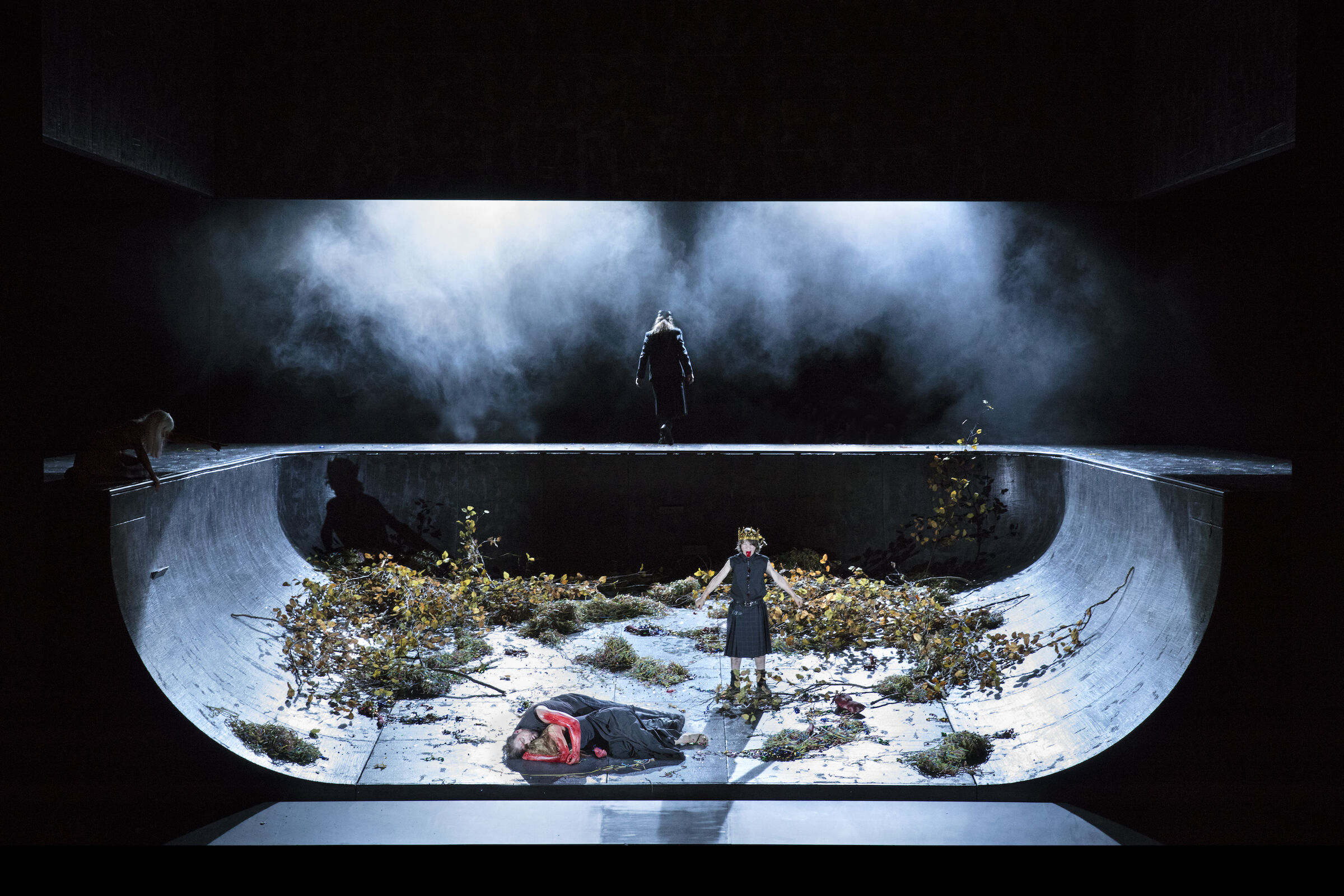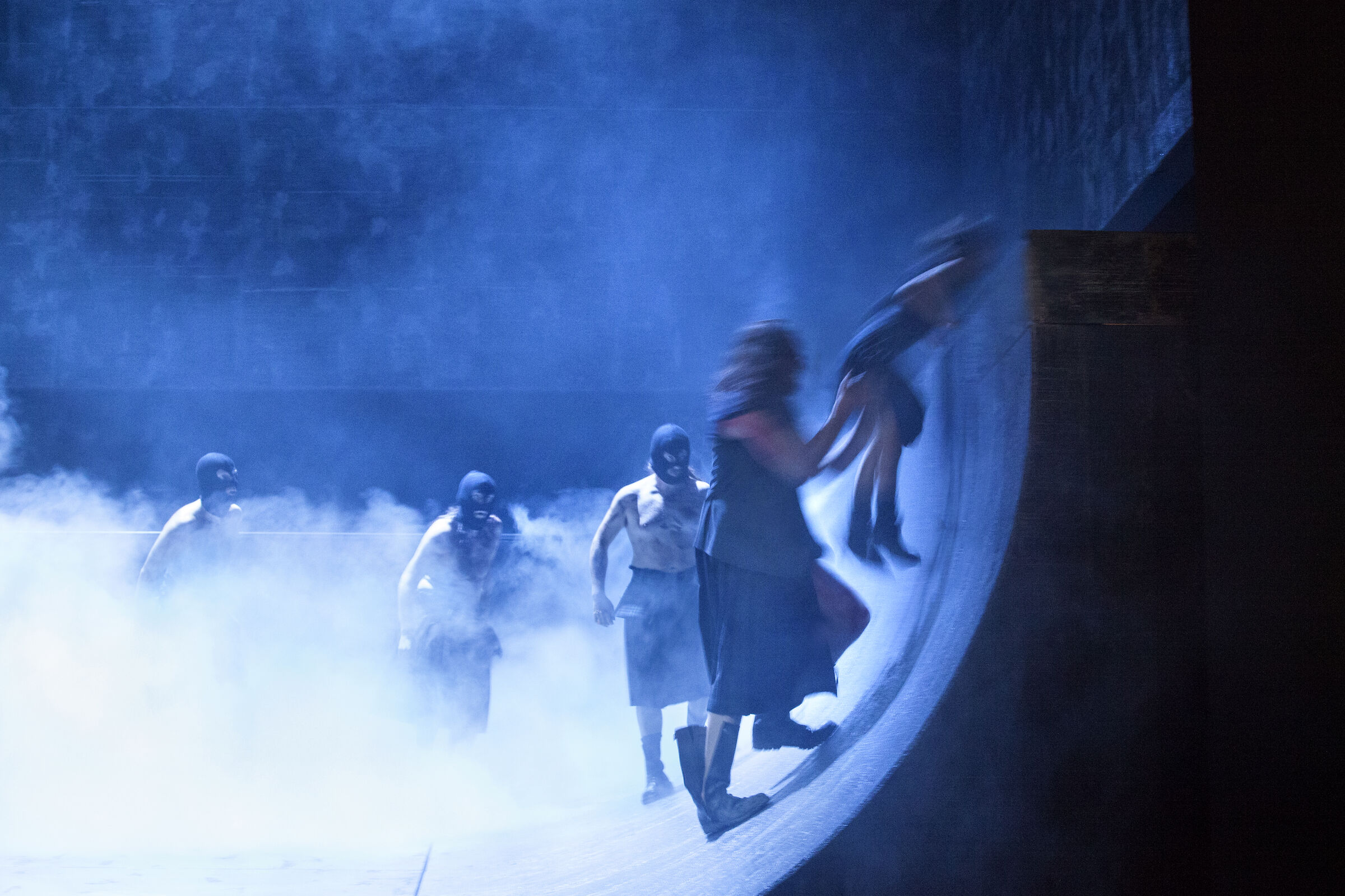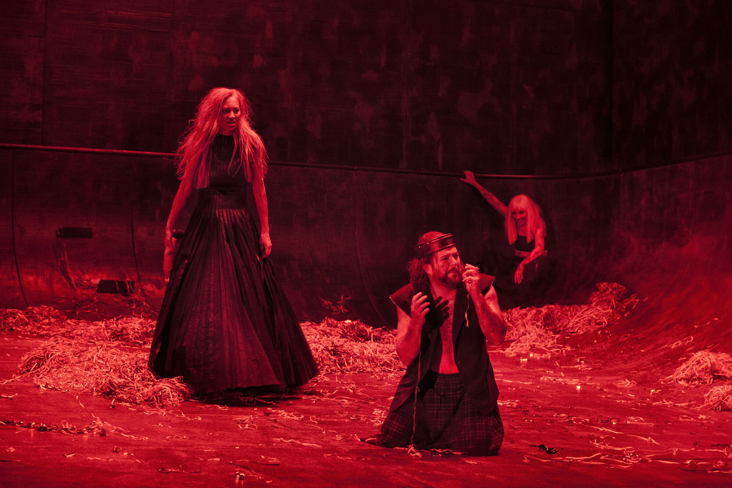 Режиссер Михаэль Тальхаймер вечную историю о борьбе за власть оставляет в мрачном шотландском Средневековье (о чем свидетельствуют грубые костюмы Микаэлы Барт, особенно традиционные килты и жилетки - безрукавки на голом теле у мужчин), не прибегая к переносам, ставшим сегодня общим местом режиссерской оперы. Сцена представляет собой огромную черную лохань, отвесные скользкие стены которой не дают возможности героям, раз скатившимся на дно, выбраться оттуда. Это своего рода метафора – преступления, совершаемые четой Макбетов, крепко приковывают к дну титульных персонажей. Нетрудно спрогнозировать: продолжившие кровавую борьбу за власть Малькольм и Макдуф в финале оперы оказываются на том же самом безнадежном дне, как и их предшественники. Идея о том, что в Шотландском королевстве не все в порядке на системном уровне, совсем не нова, ее часто используют для усиления трагического эффекта в «Макбете» (что на драматической сцене, что в опере), по сути она очень верна и хорошо работает: в этом котле бесконечных преступлений, подлости, борьбы за свое место под туманным, если не ночным шотландским солнцем, варятся все персонажи, и правых нет — одни виноватые.