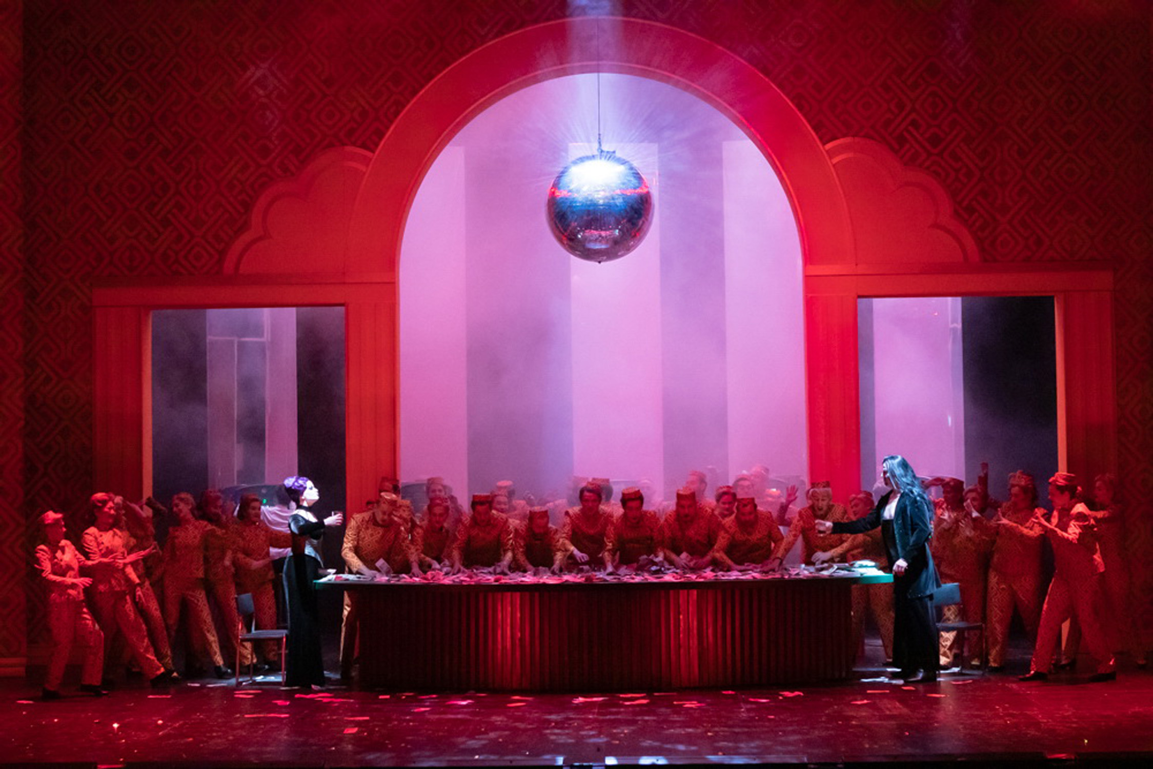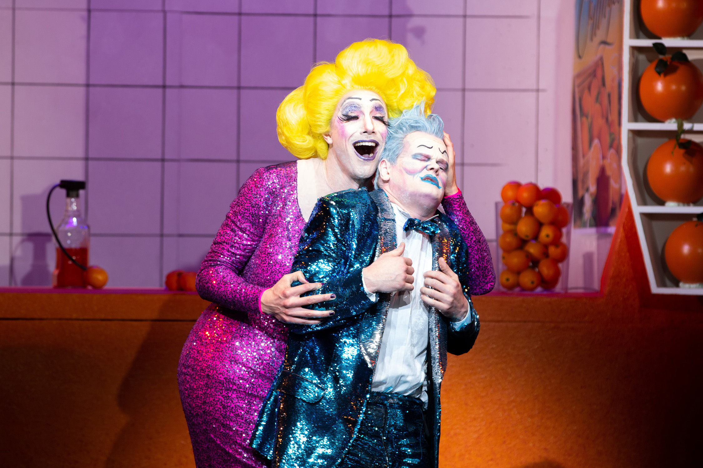 Режиссер Себастьян Ричель и сценограф Паскаль Зайбике помещают «Апельсины» в пространство тотальной игры – в казино, где все персонажи – игроки. Карточные поединки между магом Челлием и Фатой Морганой подают им такую идею. Если в либретто Прокофьева это только эпизоды, хотя и очень важные – в них решаются судьбы героев, – то в мюнстерском спектакле это сама вселенная обитателей Трефового королевства. После перепалки ревнителей разных театральных жанров и стилей, с которой опера начинается, зритель видит огромную проекцию крутящихся барабанов игрового автомата (видеохудожник Свен Стратман). Среди картинок мелькают, конечно, и заветные апельсины. Выпадают все три – бинго! Опера о фантастическом влечении к оранжевым плодам вступает в свои права.