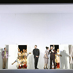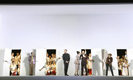 Ансамблевость – и главное достоинство спектакля как чисто театрального продукта. Сценография Йоханнеса Шюца лапидарна, если не скупа: белая стена на авансцене во все сценическое пространство, в ней четыре двери, имитирующие разные комнаты замка. Порой эта конструкция поднимается вверх, тогда зритель видит подпол или первый этаж графского дома – по лестницам бегают слуги, карабкается и спрыгивает Керубино, прячется от Графа Сюзанна. В визуальном плане монотонность разнообразят лишь костюмы Астрид Кляйн – современные и элегантные.