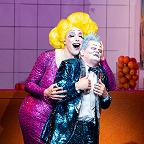 В эстетике Лас - Вегаса выдержана сценография и костюмы Себастьяна Ричеля, Катрин Шмидт и Якоба Баумгатнера: яркие, даже кричащие цвета в парадоксальных сочетаниях, костюмы - электрик, обилие блесток и стекляруса. Особенно запоминаются переливающийся фосфорически голубой костюм Труффальдино, ядовито - темно - алые, словно из выкрашенной крокодиловой кожи, одеяния Леандра и Клариче и прикид под Кончиту Вурст (прямая черная длинная юбка, глубоко декольтированный топик и копна ниспадающих черных волос) у мага Челлия.