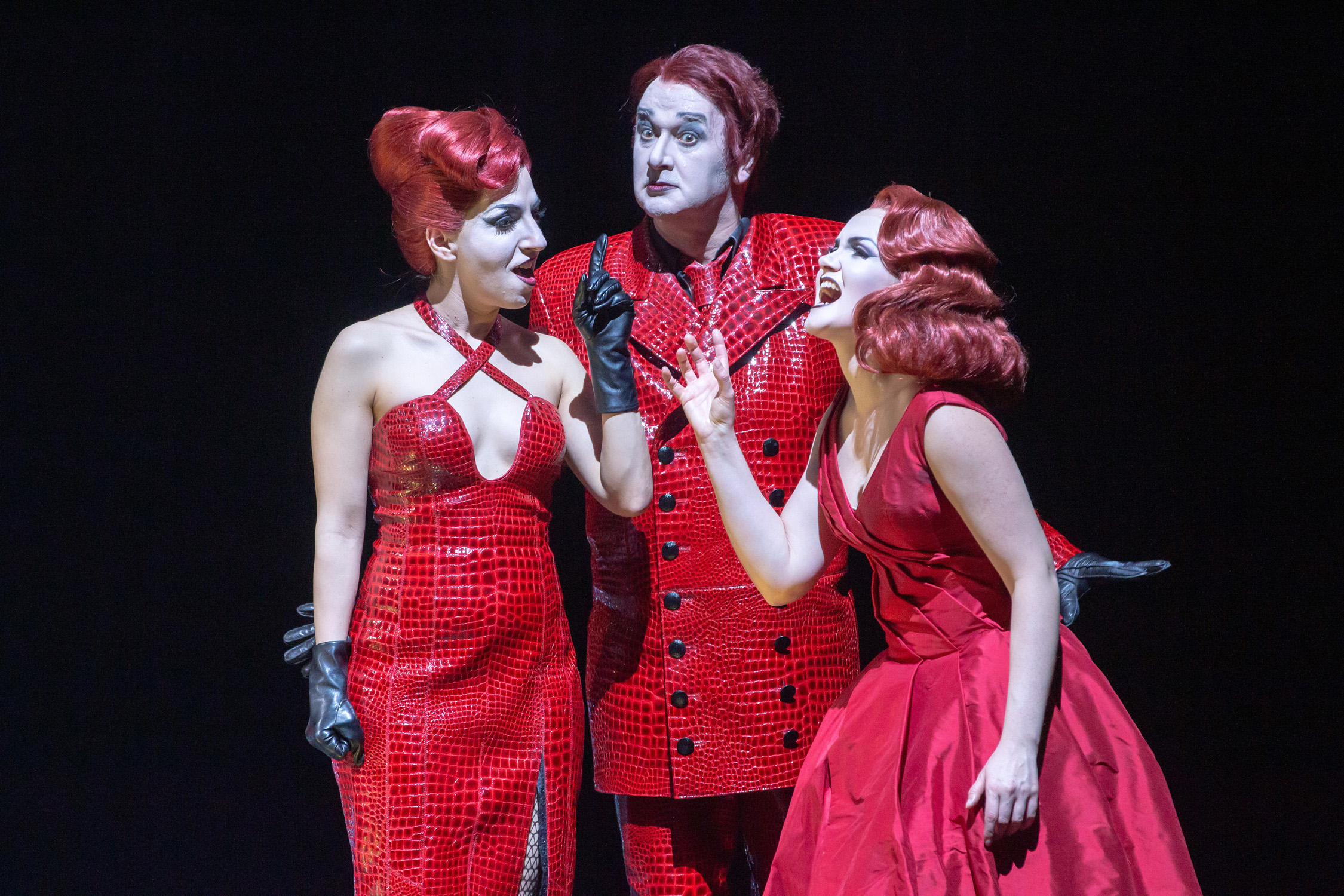 Оркестр под управлением маэстро Голо Берга играет с энтузиазмом и удовольствием, даже драйвом, точно передавая характер сочинения. Не отстает от него и мобильный, артистичный, пунктуальный хор (хормейстеры Инна Батюк и Йозеф Файгль). Вокальные задачи в опере гораздо скромнее артистических: здесь важно не столько само пение, сколько интонация и игра, и этим артисты мюнстерского театра владеют превосходно. Из всего состава особенно запомнились тенора Гарри Давислим (Принц) и Паскаль Херингтон (Труффальдино), меццо Хрисанфия Спитади (Клариче) и Кэтрин Филип (Смеральдина), сопрано Кристи Анна Изене (Фата Моргана) и Мариэль Мёрфи (Нинетта), басы Штефан Клемм (Король) и Кристоф Штегеман (Челлий) – то есть практически все, что говорит о впечатляющем и гармоничном ансамбле.