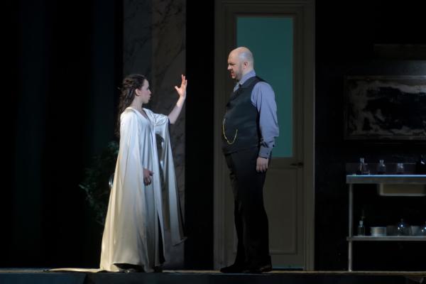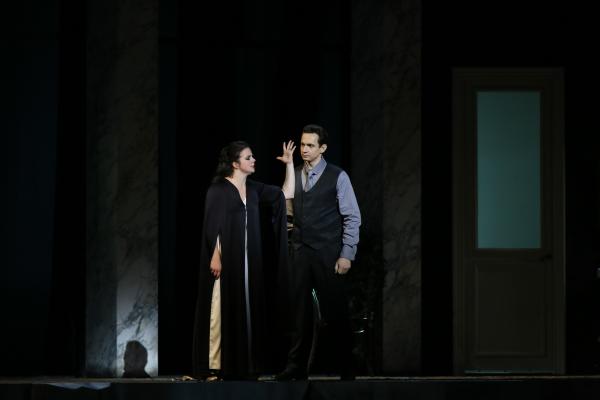 Декабрьскую премьеру доверили итальянцу Андреа де Роза – давнему другу Мариинского, сделавшему здесь в последние годы «Симона Бокканегру» и «Фальстафа». На этот раз он представил спектакль более авторский, четче вписывающийся в понятие режиссерской оперы. В постановке присутствует традиционный для этого метода перенос действия из эпохи, предписанной в либретто, в иную (в данном случае это период где-то вокруг Первой мировой войны, судя по костюмам Алессандро Лаи), действие всех трех актов разворачивается в одном унылом пространстве (сценография Симоне Маннино) – это сумрачный дом Эштонов, причем когда (по либретто) сэр Генри приходит к развалинам замка Равенсвудов в поисках Эдгара, антураж ничуть не меняется, что вызывает почти комический эффект и недоумение у публики, поскольку реплики героев прямо противоречат происходящему на сцене. Впрочем, режиссерский театр уже давно приучил нас не удивляться ничему, и очередной «топографический кретинизм» постановщиков публика оставляет незамеченным.