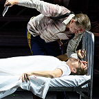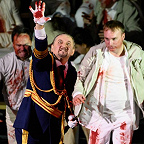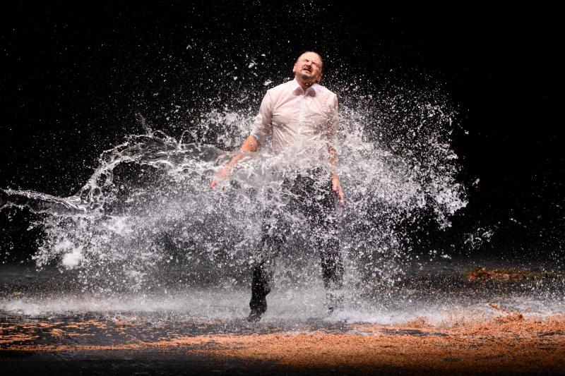 В центре повествования – мятущийся царь, испытывающий чувство вины. Это вина и перед собственным сыном (их противоречивые отношения выпукло показаны: то близость, то показное презрение со стороны властителя). Это вина и перед народом Крита (в одной из массовых сцен подданные Идоменея начинают в буквальном смысле кровоточить, покрываясь пурпурными пятнами, – грехи правителя визуализируются в мучениях демоса), народ вследствие неисполнения клятвы он подвергает испытаниям. Угрызения совести не покидают Идоменея и по отношению к морскому божеству – словом, запутался царь совершенно. Это состояние героя постановщик визуализирует очень красочно: поющий огромную и сложнейшую арию правитель мерно окатывается с разных концов сцены потоками воды, которые из ведер выплескивают на него солдаты.