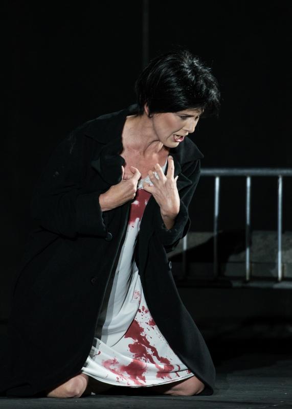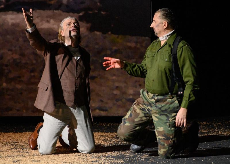 Военный камуфляж, люди с автоматами в бордовых беретах и шнурованных черных кожаных бутсах – неотъемлемые атрибуты реальности. Опера открывается сценой прямого насилия солдатни над условными «женщинами Востока» (троянскими пленницами): девушек в хиджабах приковывают наручниками к армейским кроватям и глумятся над ними весьма изощренно. Илия (троянская царевна по сюжету) – из их числа, однако ее от группового изнасилования спасает симпатия к ней критского царевича Идаманта, сына титульного героя. Лирические линии между ними, а также линия ревности и безуспешного притязания на Идаманта харизматичной Электры наиболее удачно решены режиссером, который в этом случае меньше идет от концепции, а больше слушает взволнованную музыку Моцарта. При этом вопросы власти и долга не отпускают постановщика, что оправданно: важнейшая линия оперы никак не может быть обойдена вниманием.