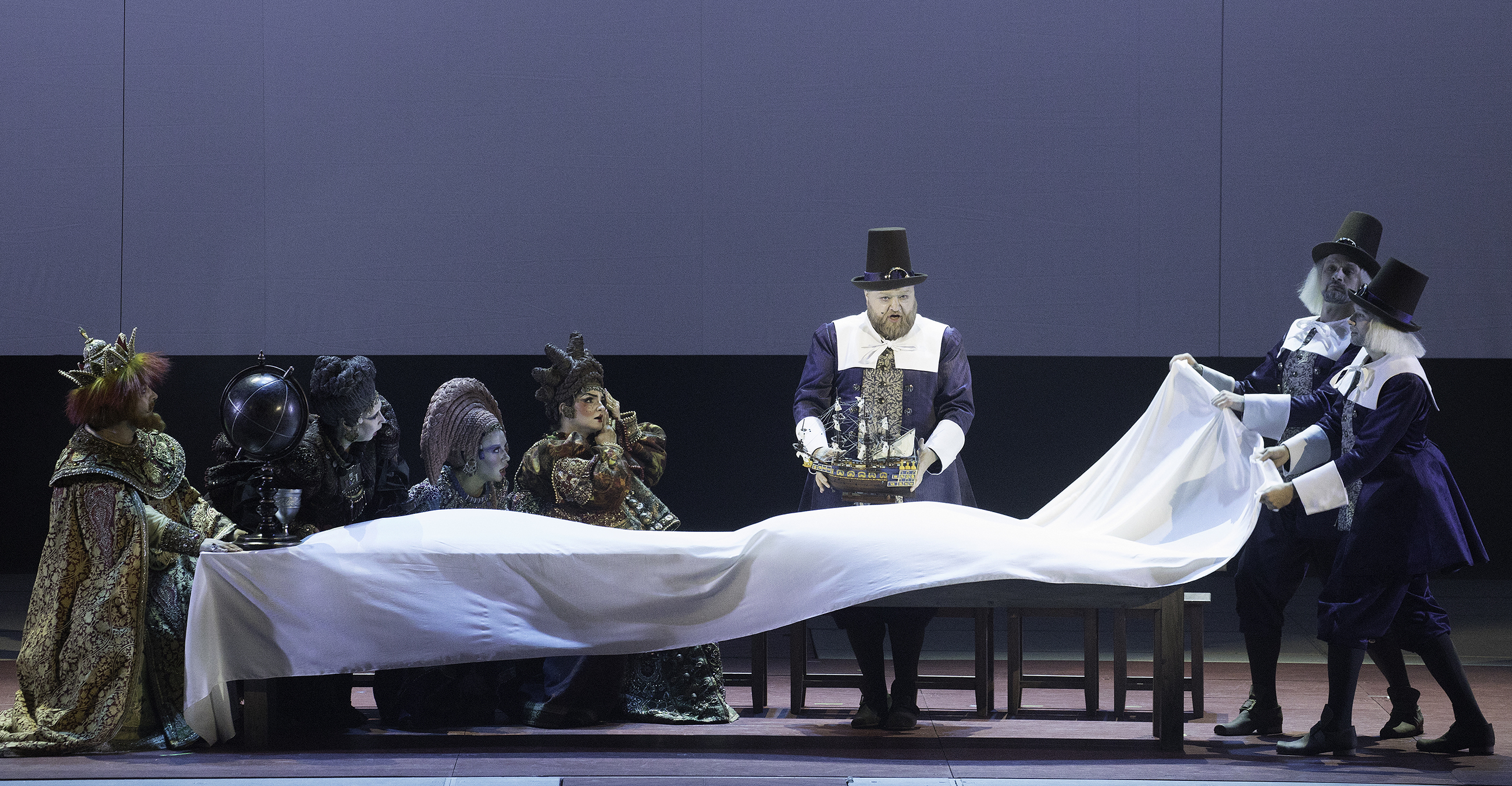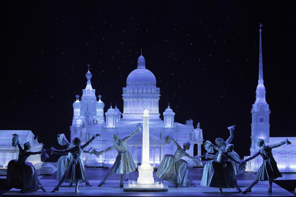 Но это не все сюрпризы постановки. Водруженный на сцене огромный короб, унылость которого при начале не обещала ничего хорошего, будет периодически раскрываться, чтобы являть заманчивые миры. Вот вам патриархально-боярская Тмутаракань, роскошным многоцветьем напоминающая дорогой ковер (его «ткал» не сценограф Зиновий Марголин, скорее, тяготеющий к скупой геометрии и такой же графике, а художник по костюмам Виктория Севрюкова). И все-то в этом царстве движется, худо-бедно взаимодействует. Во втором действии откроется Петербург-Леденец с будто вырубленными в ледяных глыбах Исаакием, Петропавловской крепостью, Спасом на Крови. Жизнь здесь, что внешняя, что внутренняя, застыла. Не будем обольщаться: режиссер ее просто не прописал. Но в статуарности и бесцветности леденцовских сцен обнаружится своя логика: ныне царствующая императрица Милитриса (обликом – Екатерина) и ее наследник здесь только гости, пережидающие, словно в анабиозе, трудные времена в судьбе. А есть еще третий мир, эпизодически вторгающийся в первые два, – заморский. За него – наряженные фламандцами Корабельщики, которым по либретто назначено протянуть ниточки между Тмутараканью и Леденцом и тем самым воссоединить несчастное семейство (наконец пассаж Великого комбинатора «Европа нам поможет!» материализовался).