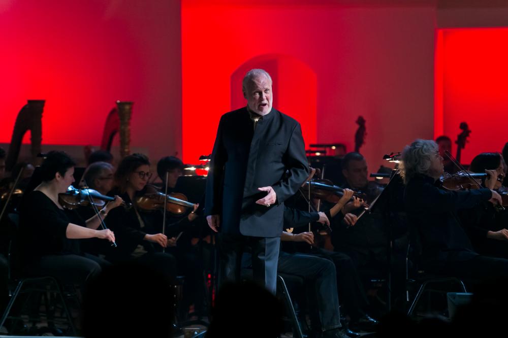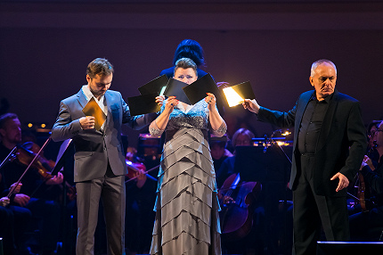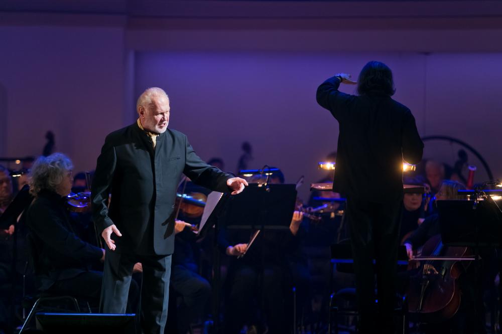 Несмотря на концертный формат, в исполнении полно театральности. Не только потому, что артисты поют наизусть и свободно двигаются по авансцене: во всем чувствуется рука режиссера Аси Чащинской. Звучит третий звонок, и после коротких объявлений конферансье зал окутывает кромешная тьма. Оркестр даже не включает лампочки на пюпитрах – музыка рейнских волн возникает, словно из первозданного хаоса, и лишь постепенно зал начинает подсвечиваться. У артистов четко выстроенные мизансцены, настоящее взаимодействие – как в полноценной театральной постановке. Они обживают не только узкую полоску перед оркестром: задействованы и портики (на правом резвятся Дочери Рейна, с левого грозно вещают великаны Фазольт и Фафнер), и зрительный зал, из глубин которого появляются игривый Логе и величественная Эрда, а в конце по центральному проходу уходят все небожители.