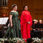 В обойму солистов была заряжена пятерка основных голосов, востребованных классической оперой XIX века: сопрано, меццо-сопрано, тенор, баритон, бас. Таковыми соответственно предстали Анна Нетребко, Екатерина Губанова, Юсиф Эйвазов, Лука Сальси (Италия), Ильдар Абдразаков, и открыла вечер арией Луизы из одноименной оперы Гюстава Шарпантье примадонна-сопрано. Новую порцию «света звезды» мы получили в ансамбле с Ю. Эйвазовым – в небольшом дуэте Адриенны и Мориса из «Адриенны Лекуврер» Чилеа. Кто бы мог подумать, что в программу будет вплетена еще и ария Герды из детской оперы «Истории Кая и Герды»! Этим хитом Сергея Баневича А. Нетребко сразила наповал. Была еще и баркарола Никлауса и Джульетты из «Сказок Гофмана» Оффенбаха, спетая в ансамбле с Е. Губановой.