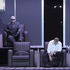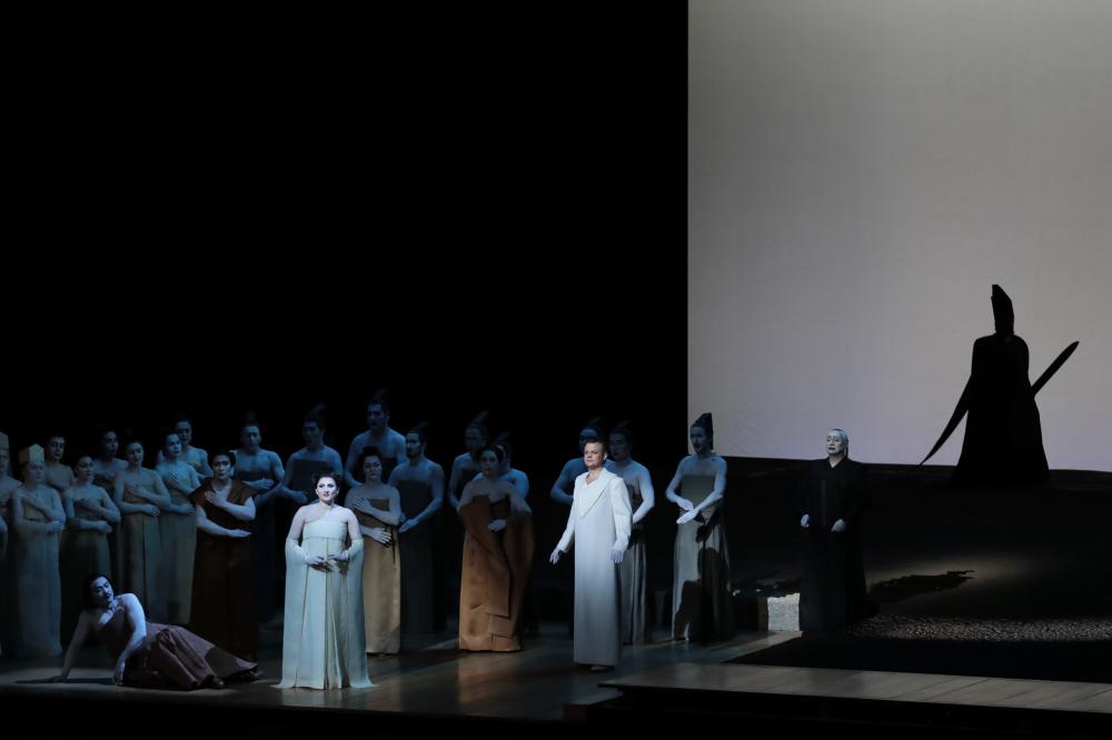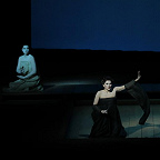 Р. Уилсон – "сам себе режиссер", а также сценограф и отчасти художник по свету, но в команде возобновления – и сорежиссер Джузеппе Фриджени, и координатор-постановщик Марина Фриджени, и художник по костюмам Фрида Пармеджани, и художник по свету Генрих Брунке, и хореограф Сузуши Ханаяги. Есть еще и драматург Хольм Келлер. И если костюмы – банальная абстракция на заданную японскую тему, надуманная пластика хореографии – наносное, что отвлекает певцов от их главного дела и решению драматургической задачи не способствует, то драматург – просто «свадебный генерал», штатный адвокат режиссерской несуразности.