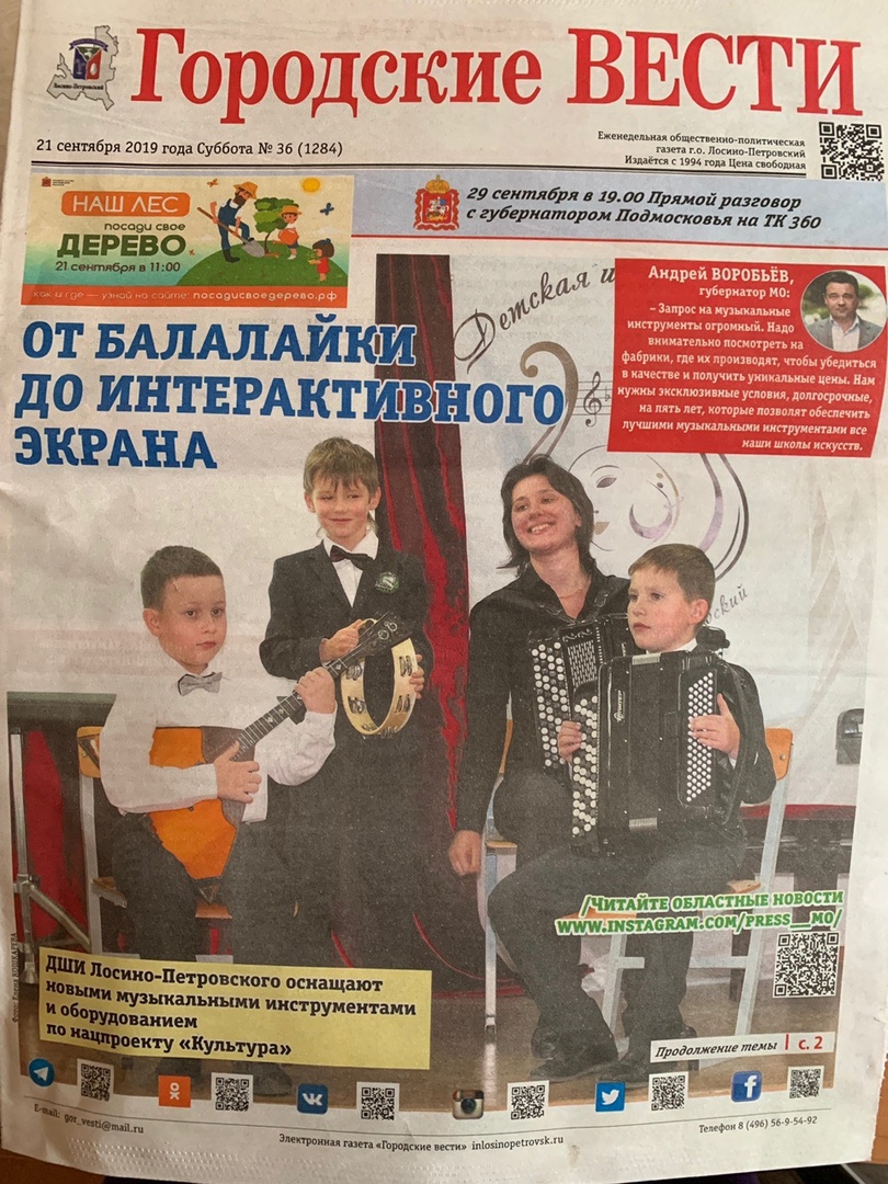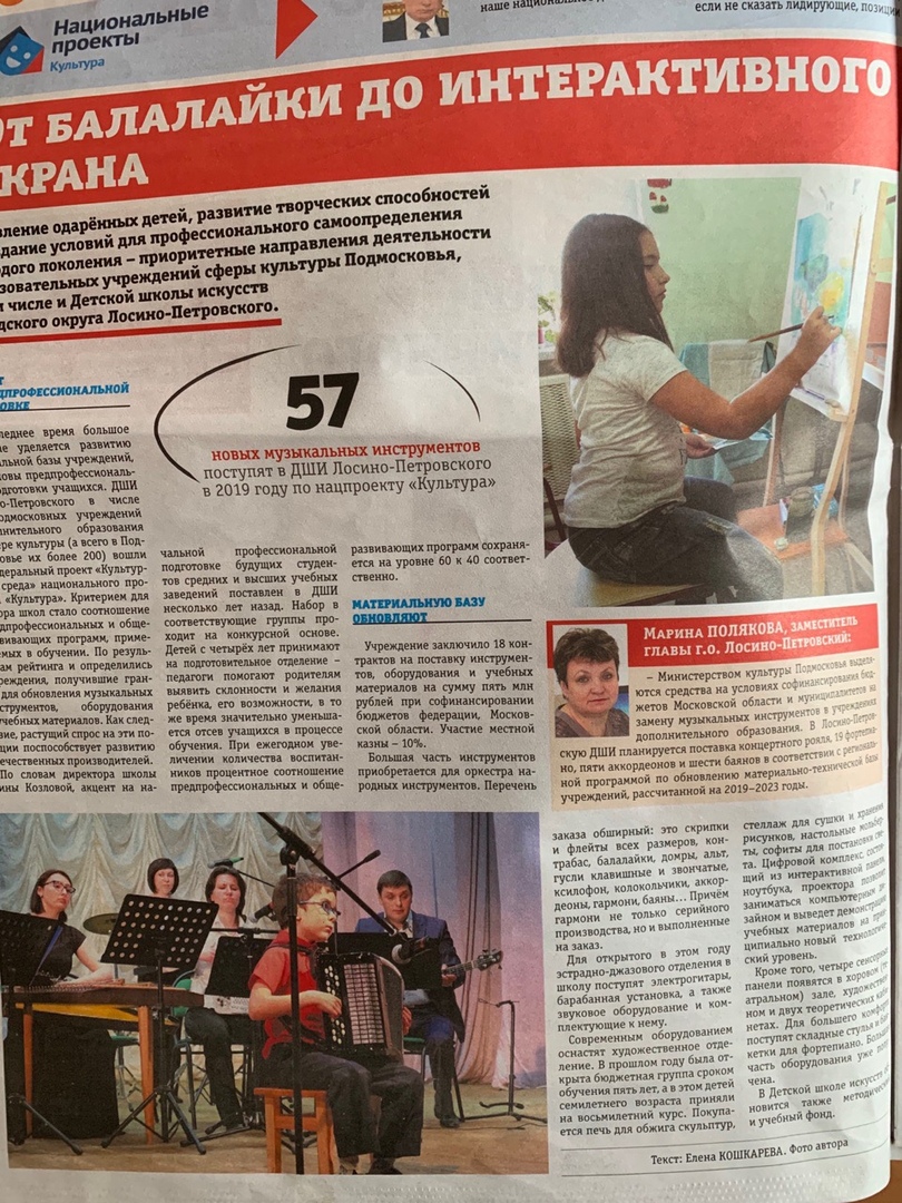 «Закрывали, конечно же, «болевые» точки, - рассказывает директор Лосино-Петровской ДШИ Нина Владимировна Козлова. – Это, прежде всего, народное отделение, которое нам удалось возродить. У нас народный оркестр очень высокого уровня по исполнительским силам, а вот качество инструментов оставляло желать лучшего. Благодаря проекту мы заменили все инструменты оркестра. На вновь открытое художественное отделение, которое два года существует в школе, купили мольберты, печь для обжига, натюрмортную стойку, стеллаж для сушки и хранения рисунков, планшет для настольного мольберта. В аудитории классов «Живопись» и «Художественное творчество» поступили интерактивные панели и оборудование, с помощью которого наши юные художники смогут изучать искусство рисования на качественно новом уровне. В теоретические кабинеты куплены цифровые комплексы, состоящие из интерактивной панели, проектора и ноутбука для наглядного сопровождения теоретических занятий: появилась возможность подавать материал в яркой, образной форме, сделать сложные темы доступными, развивать новые современные методики. В этом году мы открыли отделение инструментов эстрадного оркестра – это не получилось бы сделать, если бы не проект: в школе не было ни одного инструмента данного направления. Теперь у нас есть две ударные установки, концертный ксилофон, электрогитары, звуковое оборудование – микрофоны, усилители. И еще важный момент – в школе десятилетиями не обновлялась нотная литература. А сейчас мы купили не только ноты, но и методические и наглядные пособия, учебную литературу по разным направлениям. Все это обеспечивает новый уровень образовательного процесса».