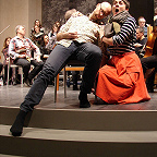 Не всем это дается с ходу. Например, тенор Валерий Микицкий в партии главного злодея Сибари поет тяжеловесно и с колоратурными пассажами в целом справляется условно. У баритона Антона Зараева (Скитальче) дела обстоят лучше, его голос гибче, но в целом манера очень пафосная, явно романтическая, едва ли подходящая к эстетике бельканто, хотя сам голос умелый и красивый. Сопрано Мария Макеева (Тамири), напротив, с техническими сложностями справляется легко, но вот образ оказывается каким-то трафаретным и мелким, на героиню не тянущим. Зато откровенно порадовали обе меццо-сопрано. В брючной роли Миртео откровенно хороша Наталья Зимина, чей высокий альт обладает необходимой терпкостью, исключительно гармоничной для мужской роли, а технически ей партию удалось сделать очень качественно.
