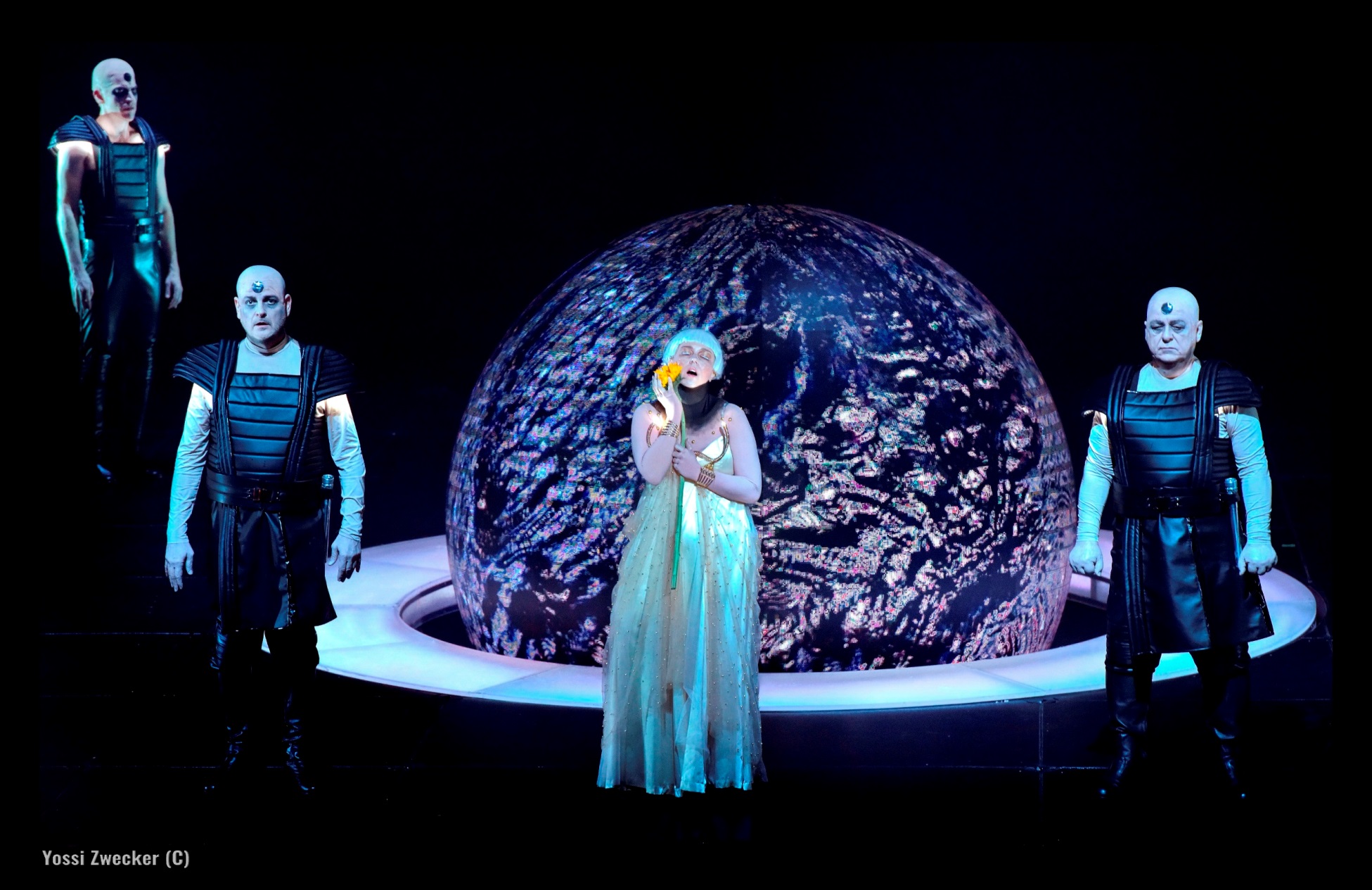 Слияние сценического действия, световой партитуры (художник по свету – Ави Йона Буэно) в течение всей оперы поразительно! Каждая звуковая краска огромного оркестра под управлением музыкального руководителя Израильской оперы Дана Этингера находит отражение и в игре света, и в движениях персонажей. Певцы (я называю первый состав, который довелось видеть и слышать) – израильская меццо Эдна Прочник (Иродиада), американские теноры Крис Меррит (Ирод) и Роберт Макферсон (Нарработ, начальник стражи) – не просто создали запоминающиеся образы, чему способствовали и очень характерные костюмы (художник-костюмер – Орна Сморгонская), но и расцветили общую звуковую палитру множеством вокальных изюминок в своих труднейших партиях.