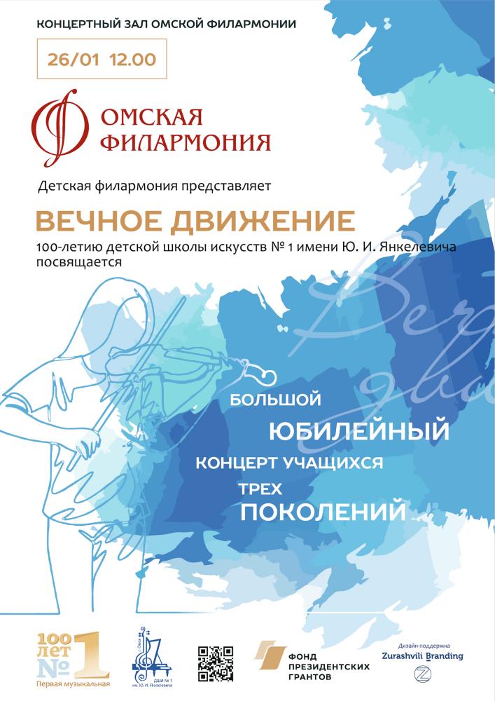 Кульминацией празднования 100-летия детского музыкального образования в Омске стал незабываемый большой концерт учащихся школы трех поколений. На сцене двести детей в доброй традиции лучших детских концертов Центрального телевидения: солисты и ансамбли, большой сводный хор. Художественно-музыкальная композиция в первом отделении и филармоническая программа струнного оркестра школы с юными солистами всех отделений во втором с потрясающими номерами – такими, как выступление сводного ансамбля скрипачей омских школ, где сейчас работают педагоги, учившиеся когда-то в первой школе. 50 ребятишек исполнили символическое для школы «Вечное движение» Бома. «Вечное движение» – это девиз, под которым вот уже 100 лет детская школа искусств № 1 имени Ю. И. Янкелевича находит таланты и дает им путевку в жизнь.