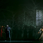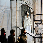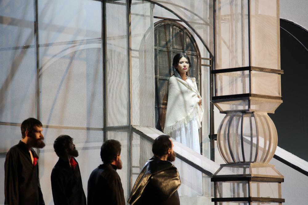 В остальном просторная сцена остается почти пустой – на ней свободно строятся мизансцены. Лишь однажды постановщик отступает от этого принципа – финал дан преимущественно на авансцене, а «палаты» за тюлевым занавесом играют роль потустороннего мира, где венчаются души Марфы и Лыкова. Идея интересная, но ее следствием является скученность героев на узкой полоске перед оркестровой ямой и невнятность трагедийного разрешения оперы (сумасшествие главной героини, убийство Любаши и пр.).
