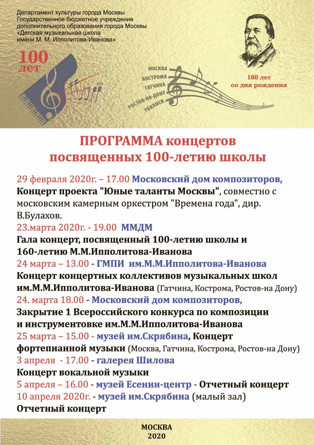 К 100-летию школы был приурочен I Всероссийский конкурс по композиции и инструментовке «Современное звучание», посвященный творчеству Ипполитова-Иванова. Конкурс собрал более 100 участников из разных регионов России. «По итогам конкурса мы планируем издать три сборника лучших работ и инструментовок, - рассказывает директор Московской ДМШ им. М.М. Ипполитова-Иванова Ольга Владимировна Черезова. - Конкурс помог многое переосмыслить, иначе взглянуть на музыку Ипполитова-Иванова. Концерты, посвященные композитору, его ученикам, коллегам, соратникам идут перед юбилеем весь год. 29 февраля в Доме композиторов наши юные солисты играли с оркестром «Времена года» под управлением маэстро Ю. Булахова. Мы планируем выступления в Государственном музыкально-педагогическом институте им. Ипполитова-Иванова и в Большом зале музее Скрябина. Мы готовимся к юбилейному концерту, который пройдет в Доме музыки: на него мы пригласили дорогих гостей, наших коллег из регионов, представителей школ, которые носят имя Ипполитова-Иванова. К нам приедут оркестр и хор из Костромы, камерный оркестр и хор из Гатчины, солисты из Ростова-на-Дону. Очень ждем и надеемся, что присоединится и Тбилиси. Впервые мы сыграем и споем все вместе – в большой юбилейной программе сводные оркестры и хоры школ имени Ипполитова-Иванова будут исполнять его музыку».