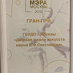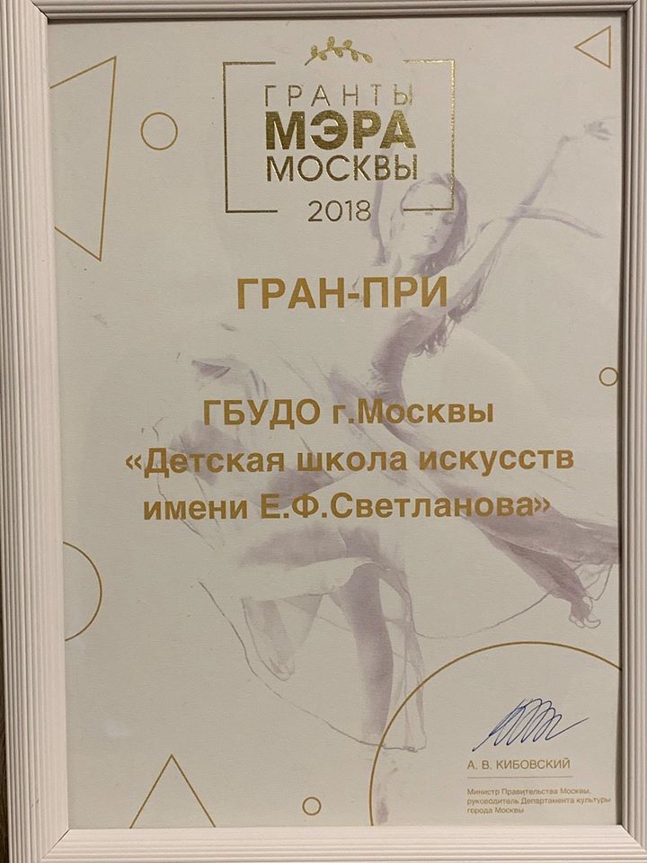 В 2018 году Детская школа искусств имени Е.Ф. Светланова стала обладателем Гран-при конкурса на гранты Мэра Москвы в сфере культуры и искусства. Гранты Мэра Москвы присуждаются три года подряд. Главная цель — поддержка и развитие одаренных детей и молодежи, которые добились первых серьезных успехов в искусстве. «Победить среди 154 образовательных учреждений, это как получить «Оскар» среди музыкальных школ, - говорит директор ДШИ им. Светланова Сергей Рязанцев. - Думаю, что это высокая оценка нашей работы в области инклюзивного образования».