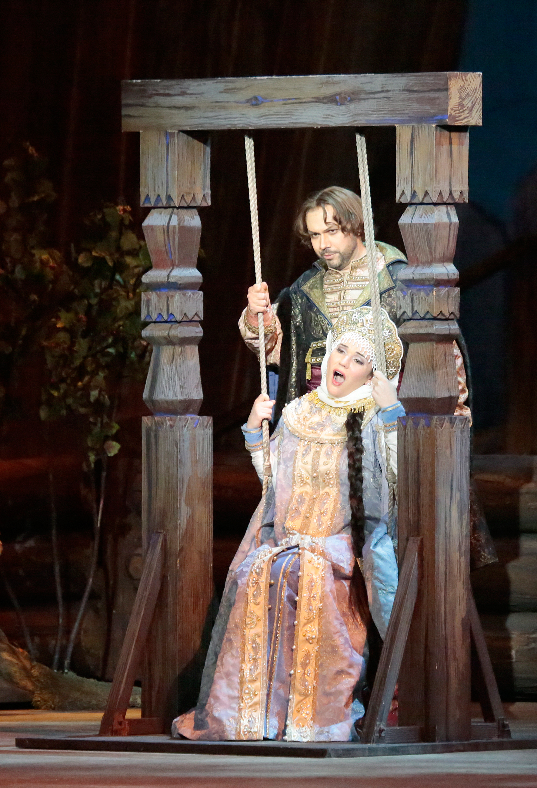 Марфу спела Ольга Селиверстова, Лыкова – Илья Селиванов. Стажировавшаяся в Париже выпускница Московской консерватории недавно исполняла главные партии в таких важных премьерах Большого, как «Путешествие в Реймс» и «Снегурочка», активно задействована в текущем репертуаре. Красивая певица с не самым выдающимся, но вполне техничным, профессионально «сделанным» голосом, в титульной партии смотрится весьма органично. Пение свободное, верхи уверенные, дикция отличная, фразировка осмысленная, актерская игра – естественная. Бывший мариинский тенор, ставший не так давно солистом Большого, сегодня также весьма востребован (в первой премьере этого сезона он пел, например, Гвидона в «Сказке о царе Салтане»): его голос в партии Лыкова звучит ровно и звонко, но в то же время без особого разнообразия и с заметным самолюбованием, а ходульное актерствование едва ли можно назвать существованием в образе.